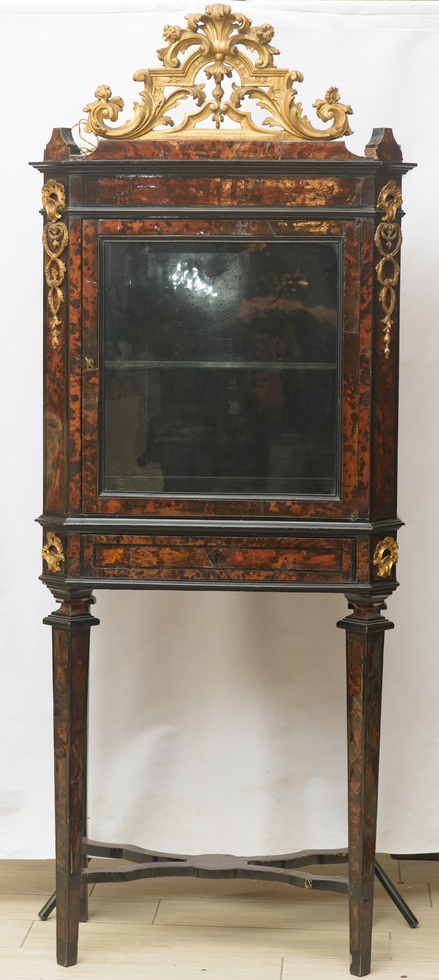 a due corpi, con cassetto centrale e anta superiore a vetro. Legno ebanizzato con materiali pregiati e decorazioni e cimasa in legno dorato e intagliato. Quattro piedi rastremati e raccordati. Mancante di un vetro laterale. Restauri e mancanze.