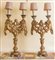 in legno dorato e intagliato, a due luci. Adattate a lampade d'appoggio.