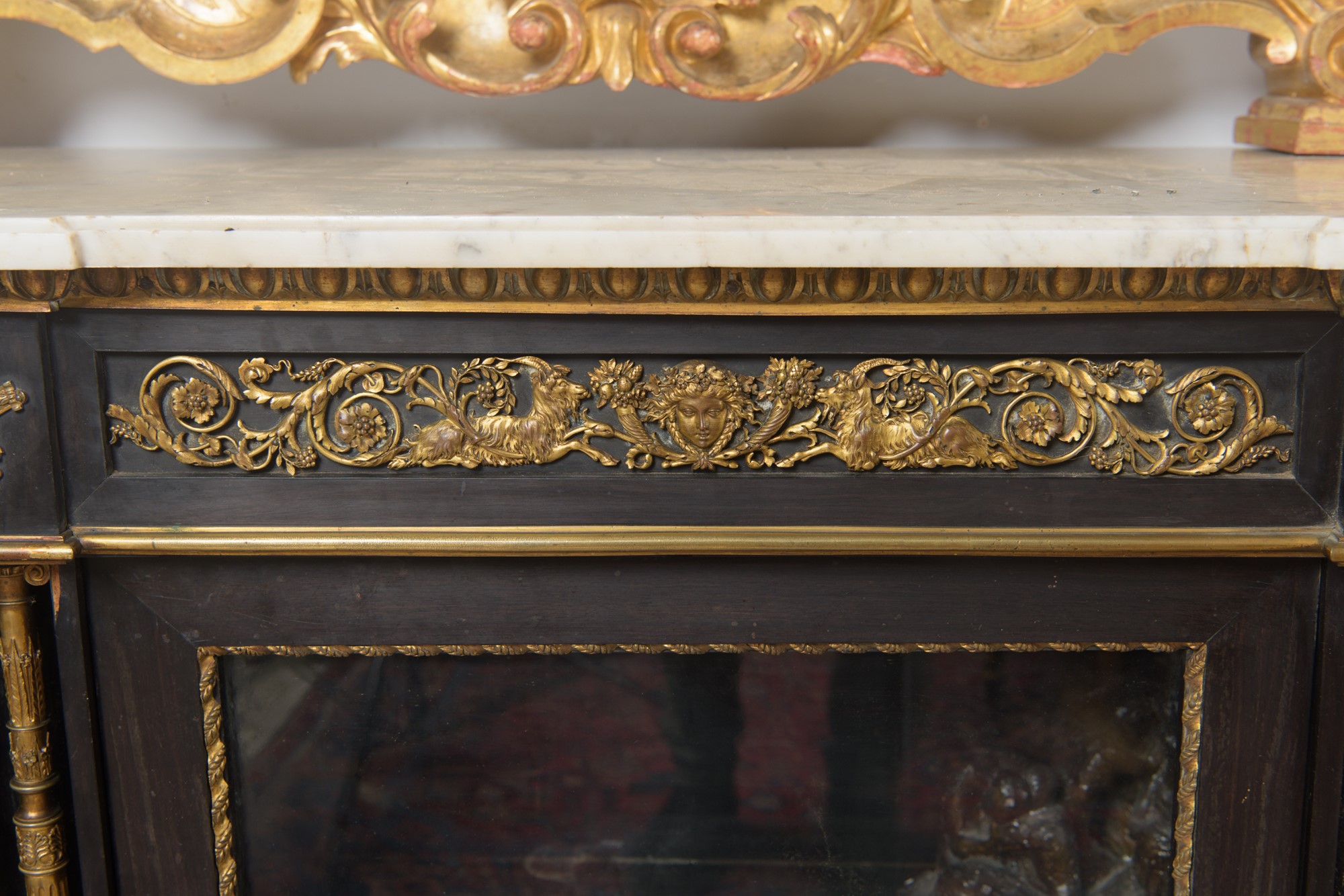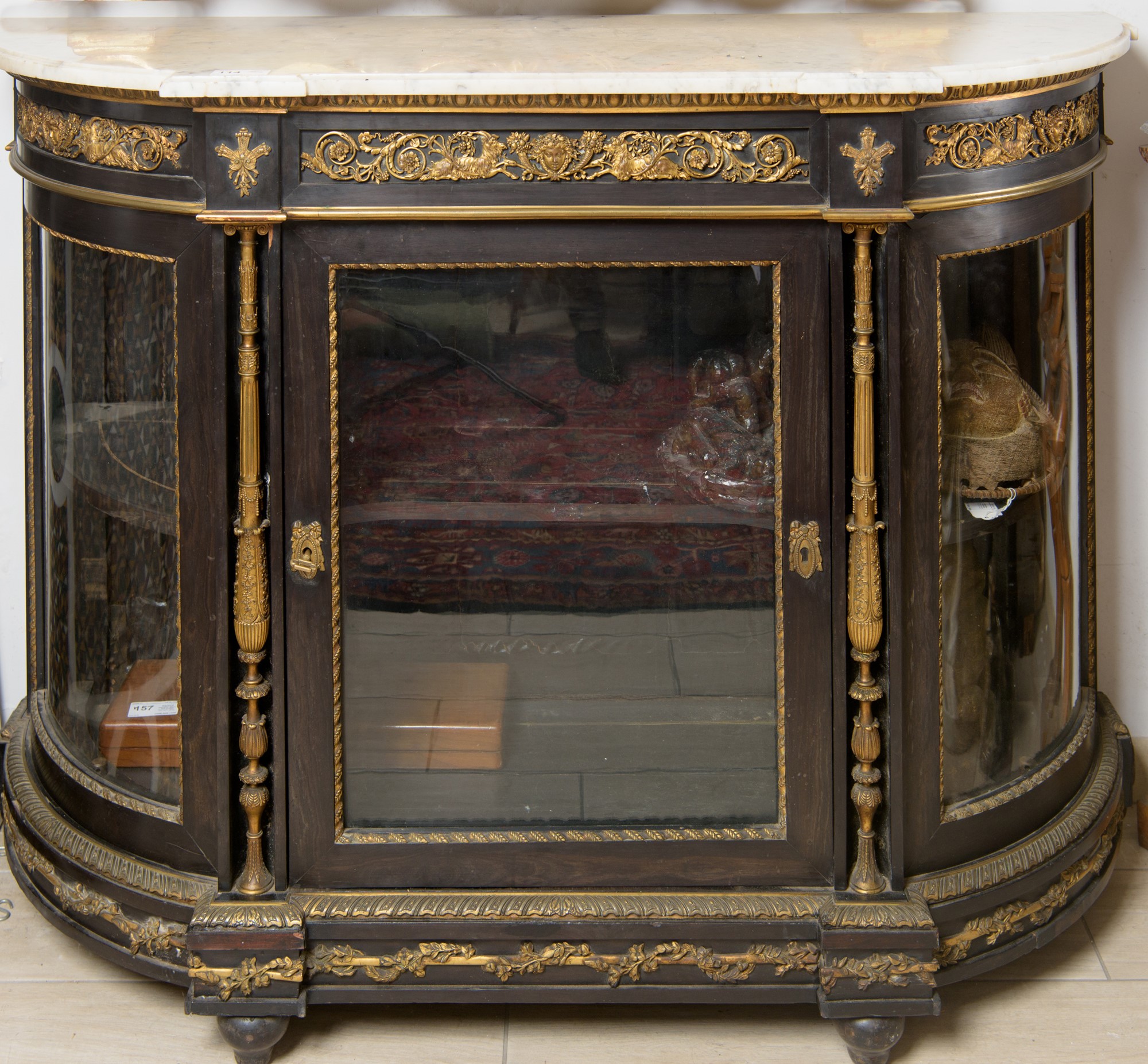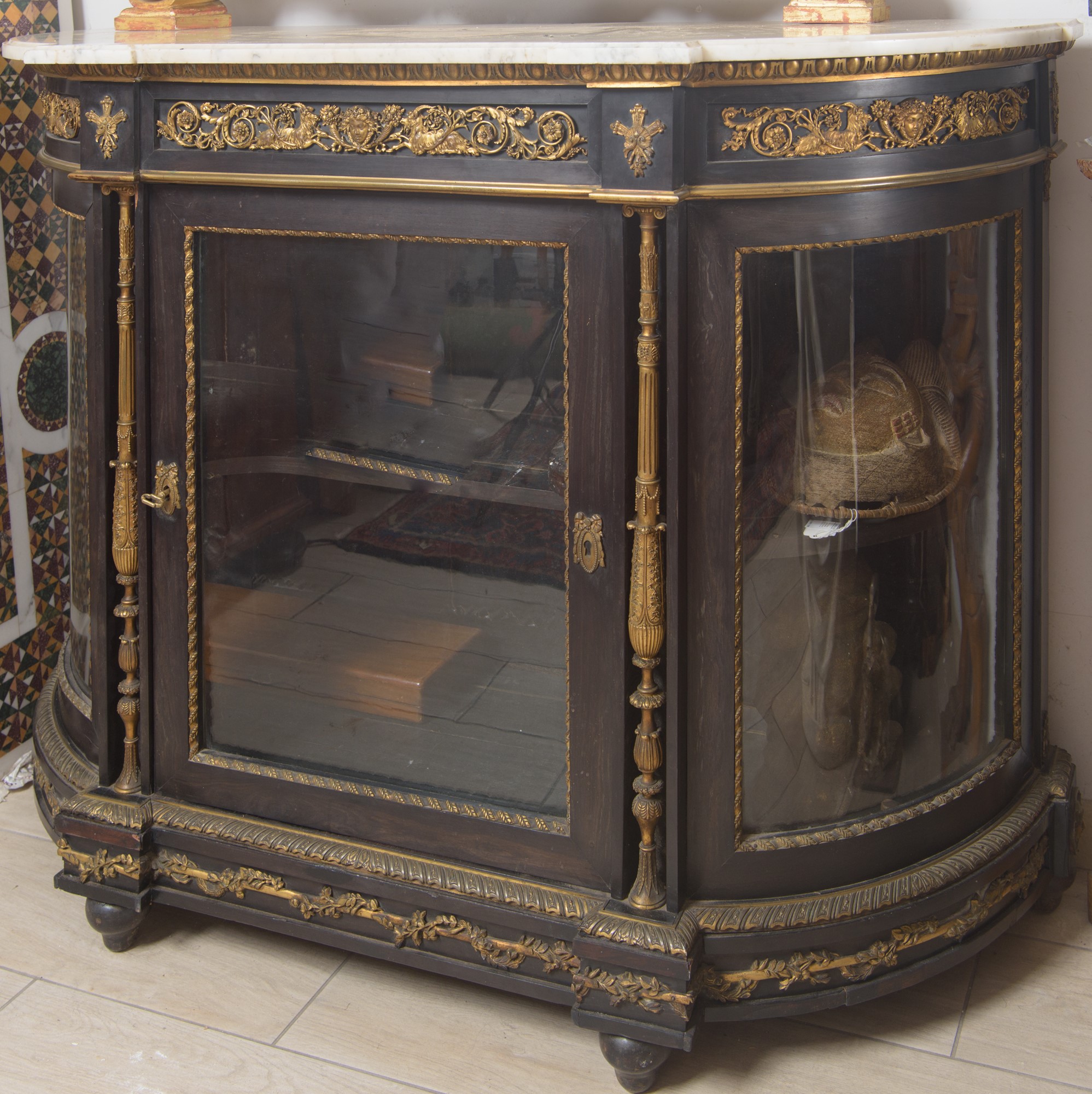 con anta unica centrale a vetri. In ebano placcato su rovere. Guarnizioni in bronzo dorato e finemente cesellato, con piano in marmo bianco. Stampigliato sotto il marmo Befort Jeune.