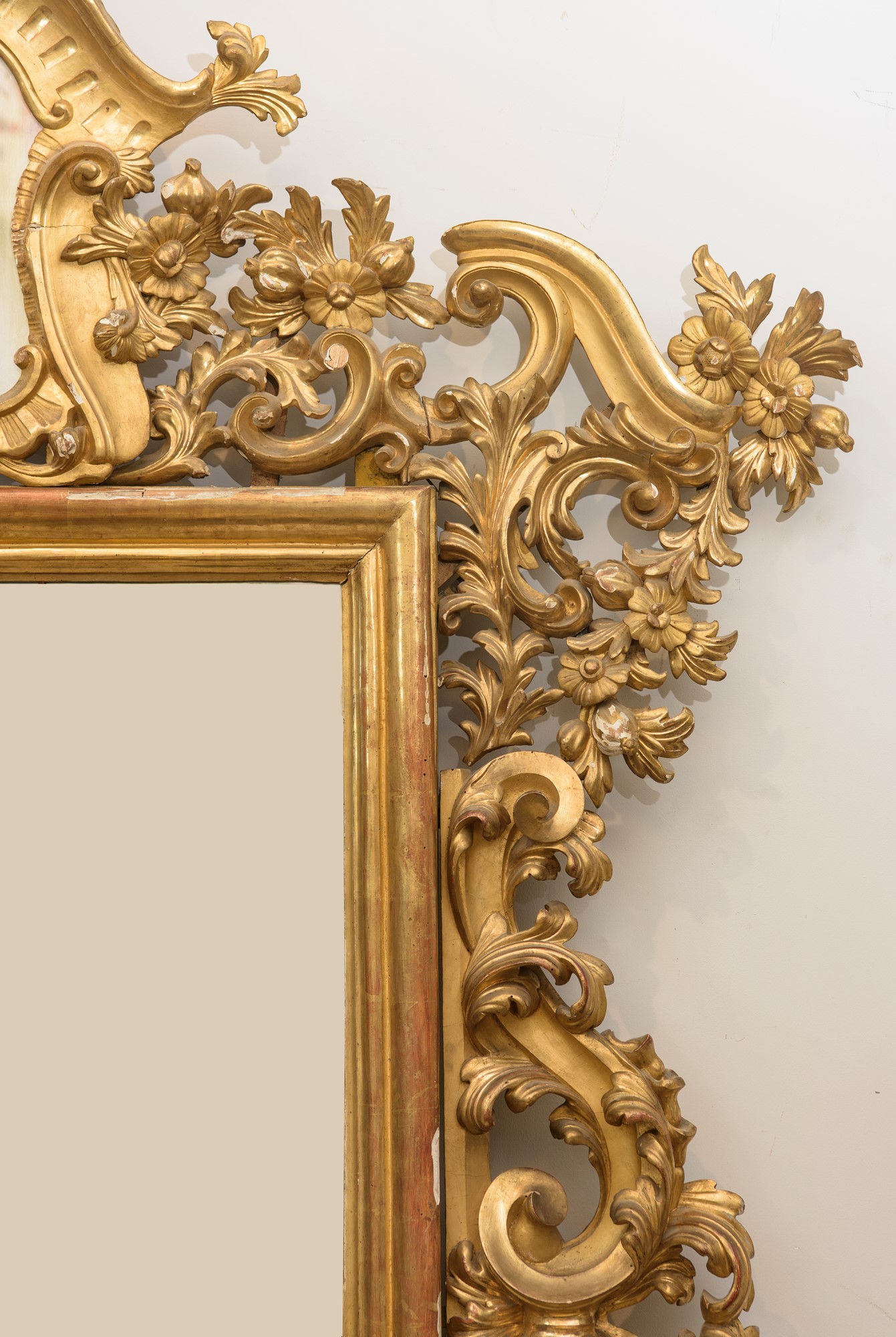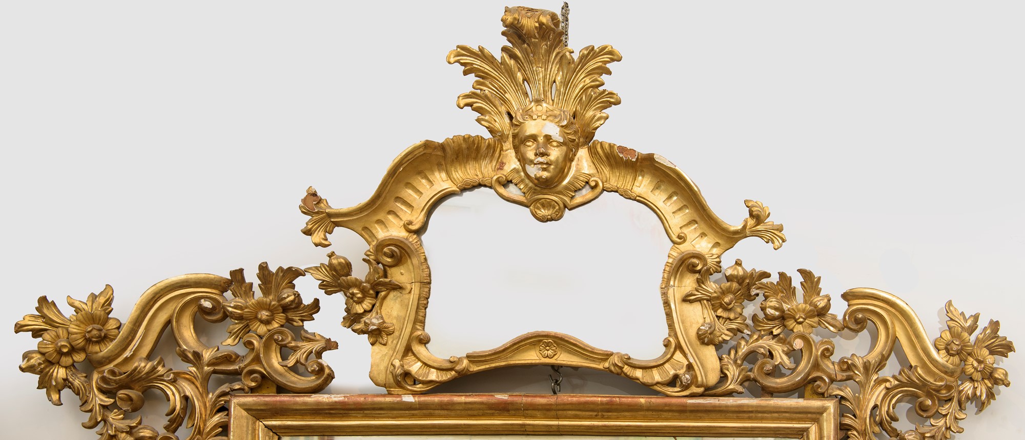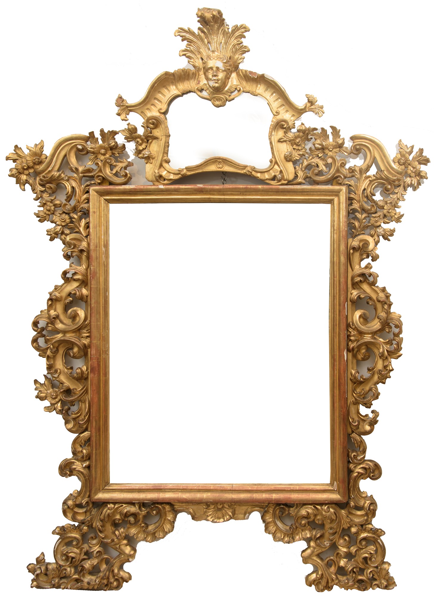 in legno intagliato e dorato, con ampie volute a motivi floreali. Ampia cimasa superiore. Manifattura francese di linea Luigi XIV. Restauri e mancanze