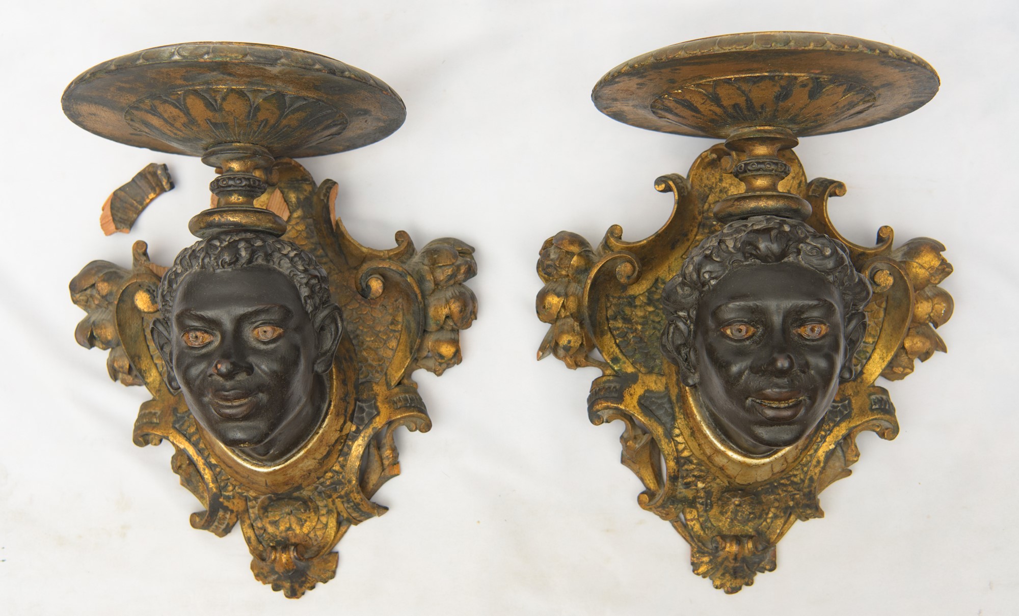 In legno intagliato. A forma di teste di moro. Con foro elettrificabile. Piccoli difetti e mancanze.