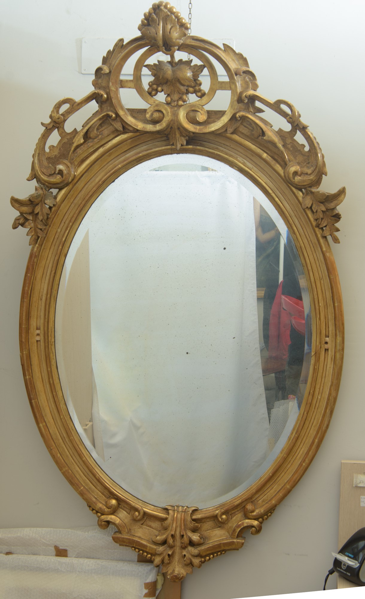 in legno intagliato e dorato, con ampia cimasa. Specchio molato di origine.