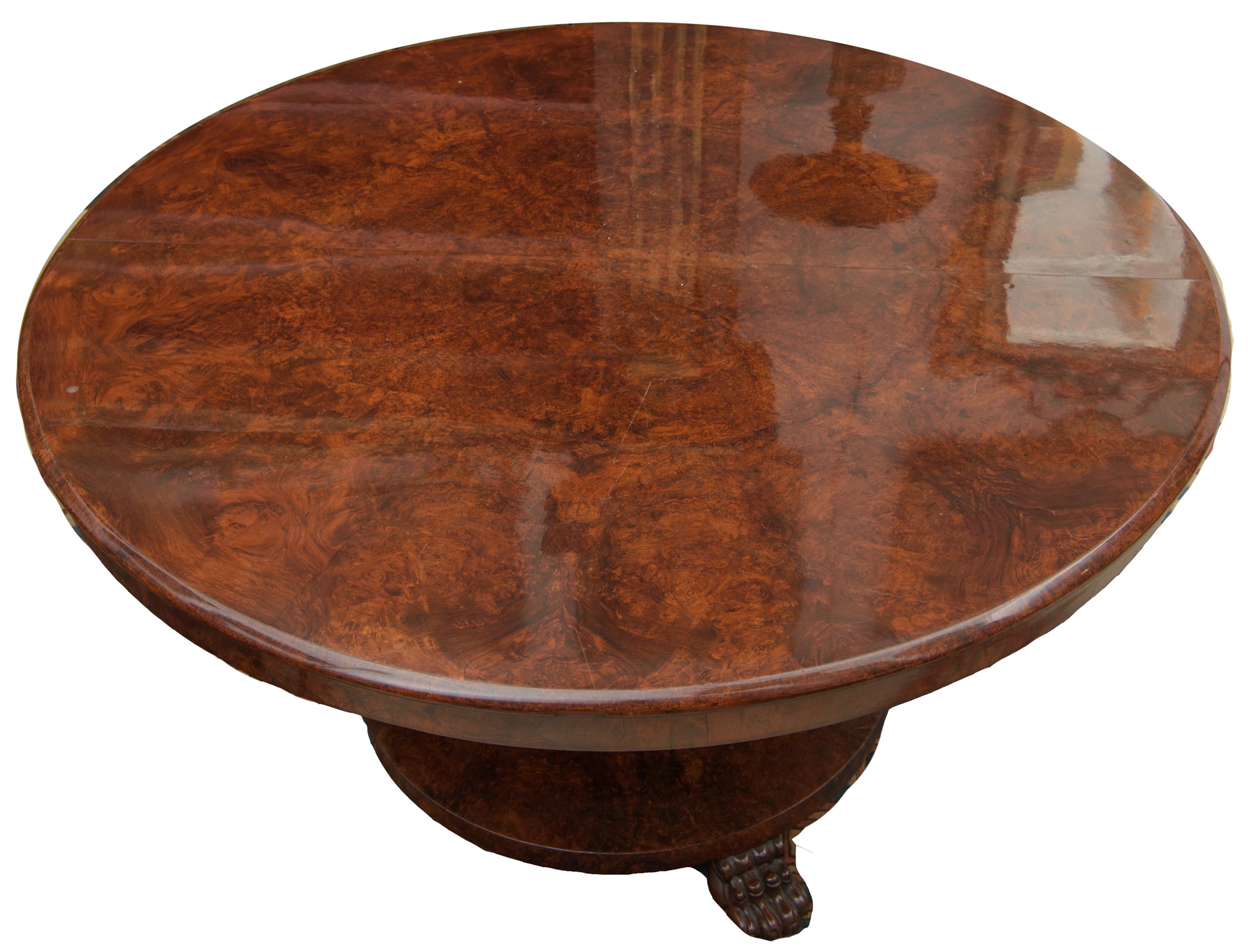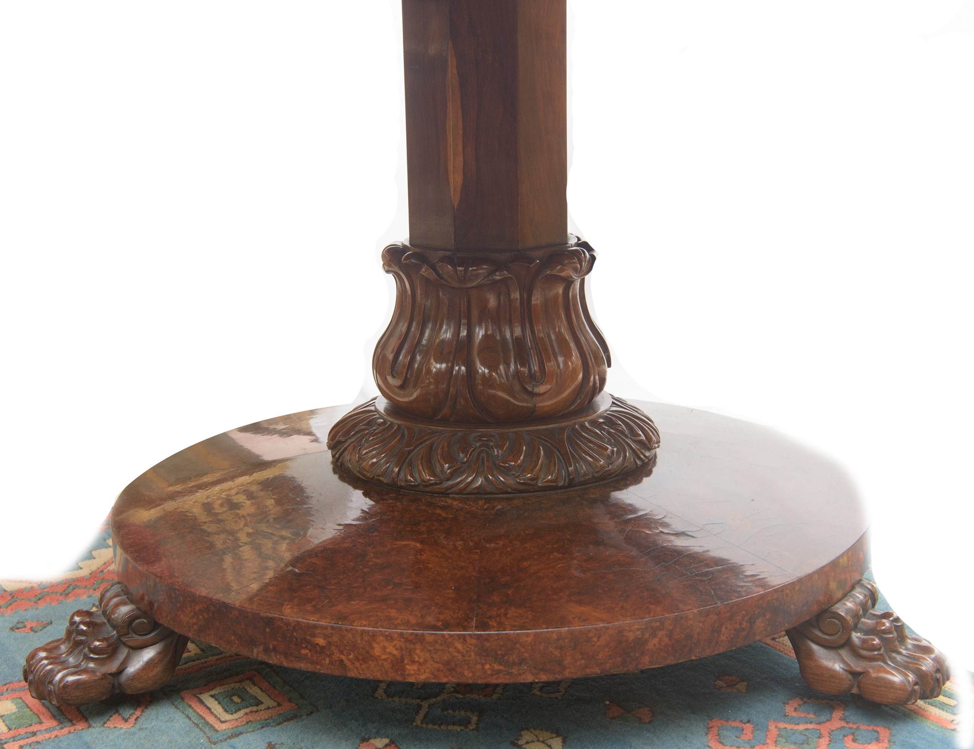 in noce e radica di noce con piede centrale e tre piedi felini.