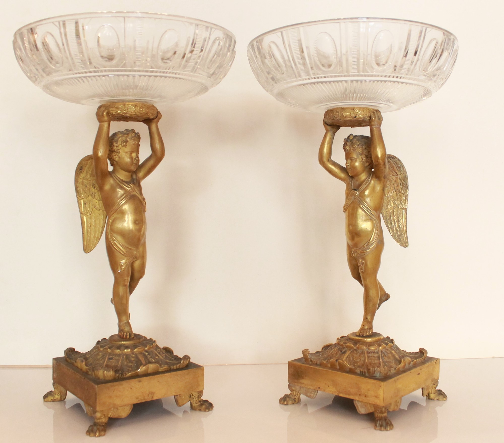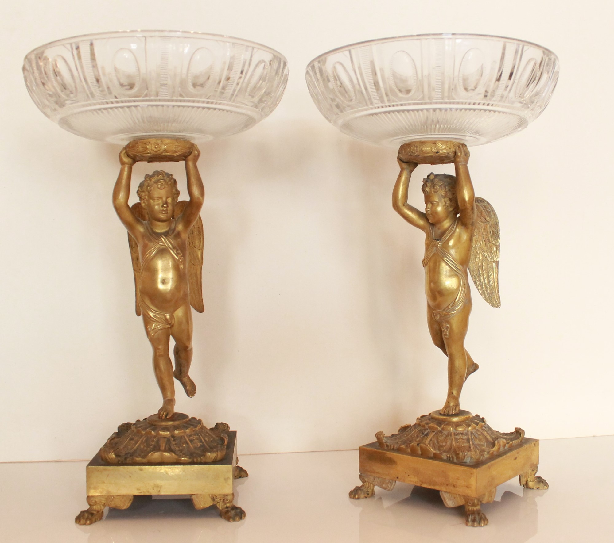 Base quadrata con piedi ferini e fusto raffigurante un amorino. Coppe in vetro molato. Manifattura francese.