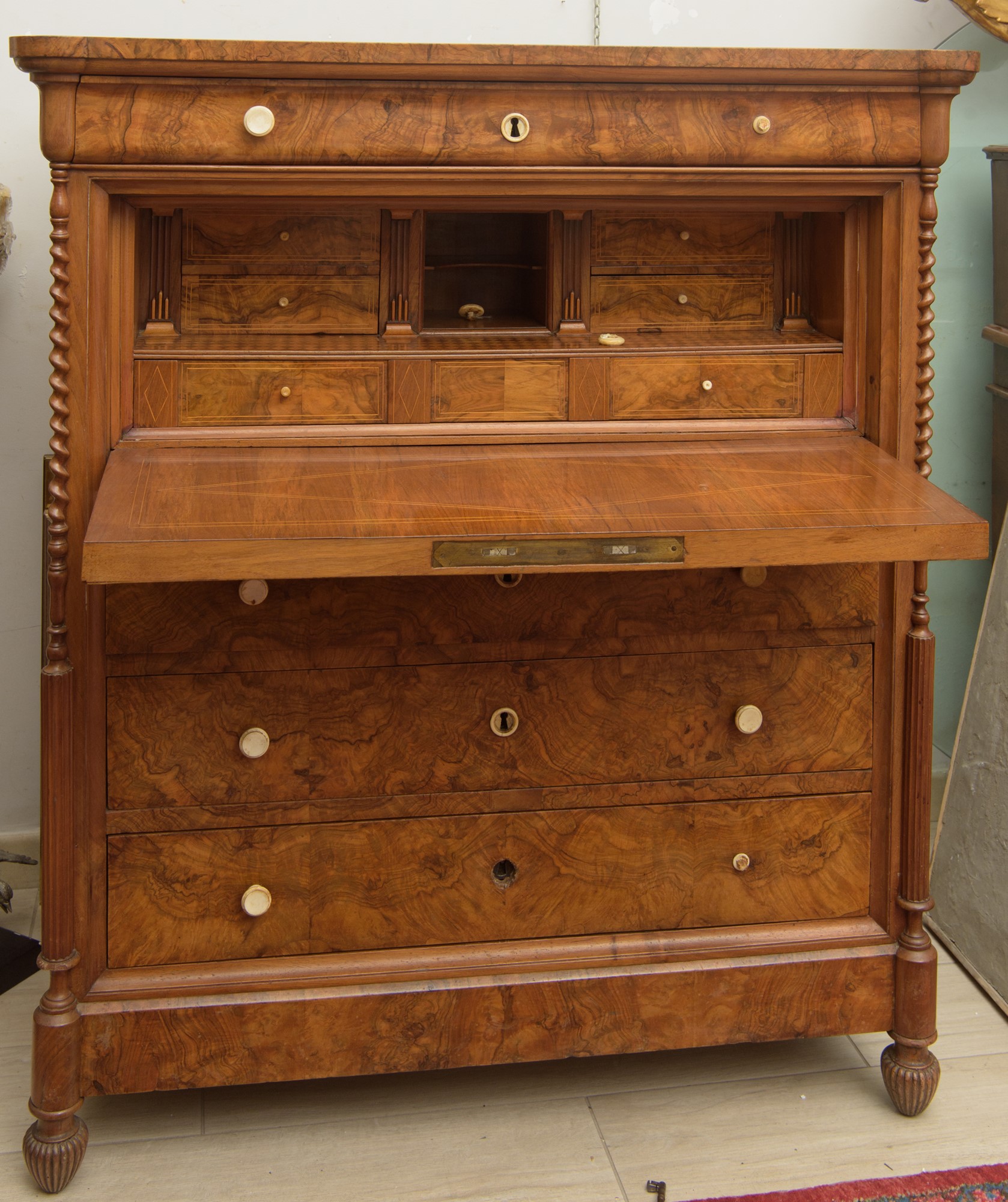 in legno di noce e radica di noce, quattro cassetti, calatoia con cassettiera interna. Bocchette e maniglie in osso