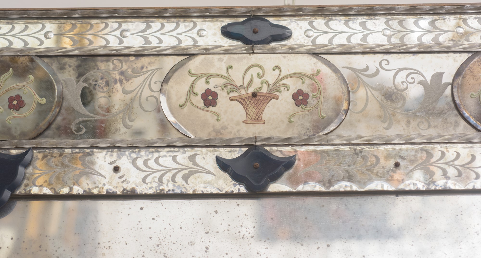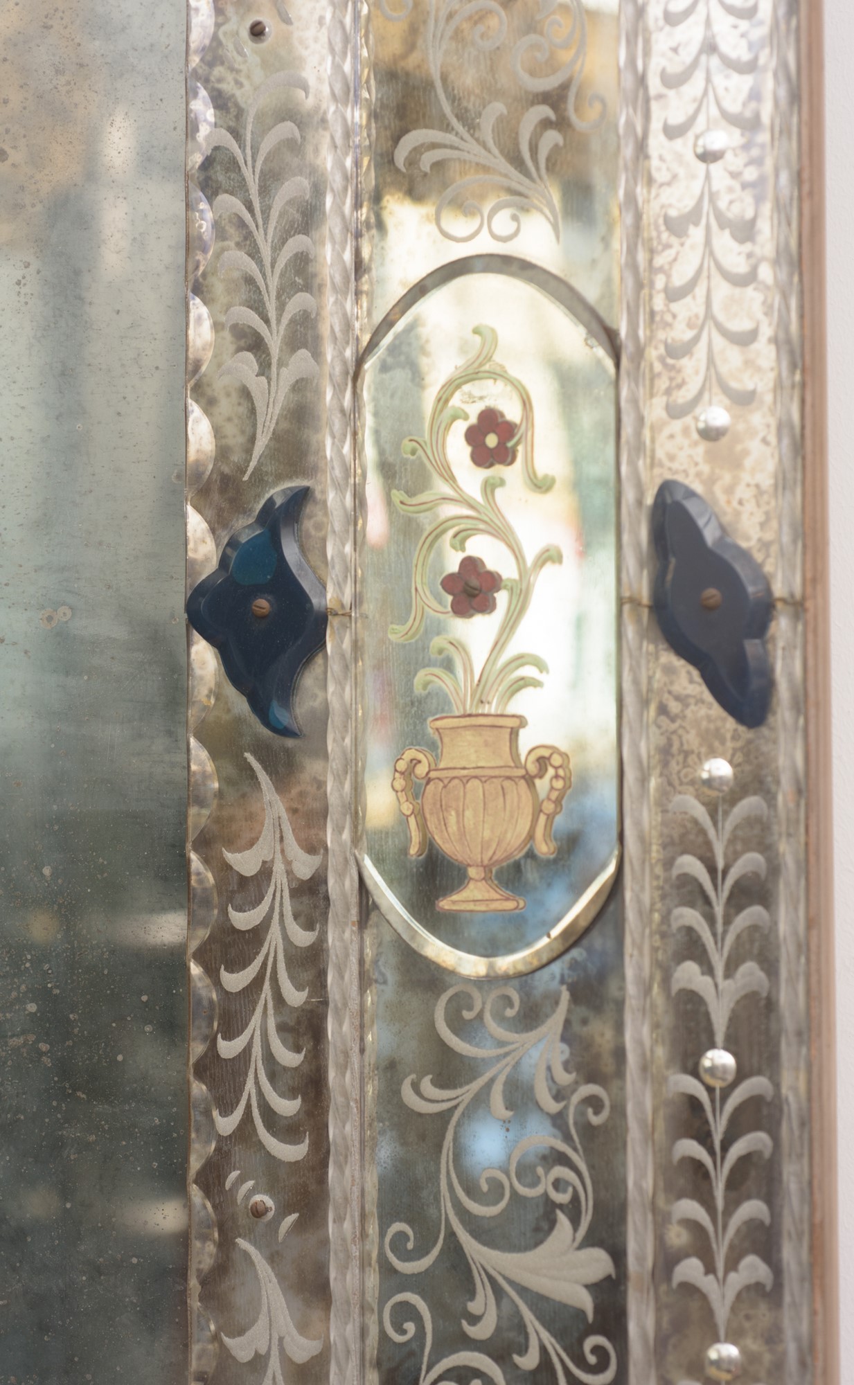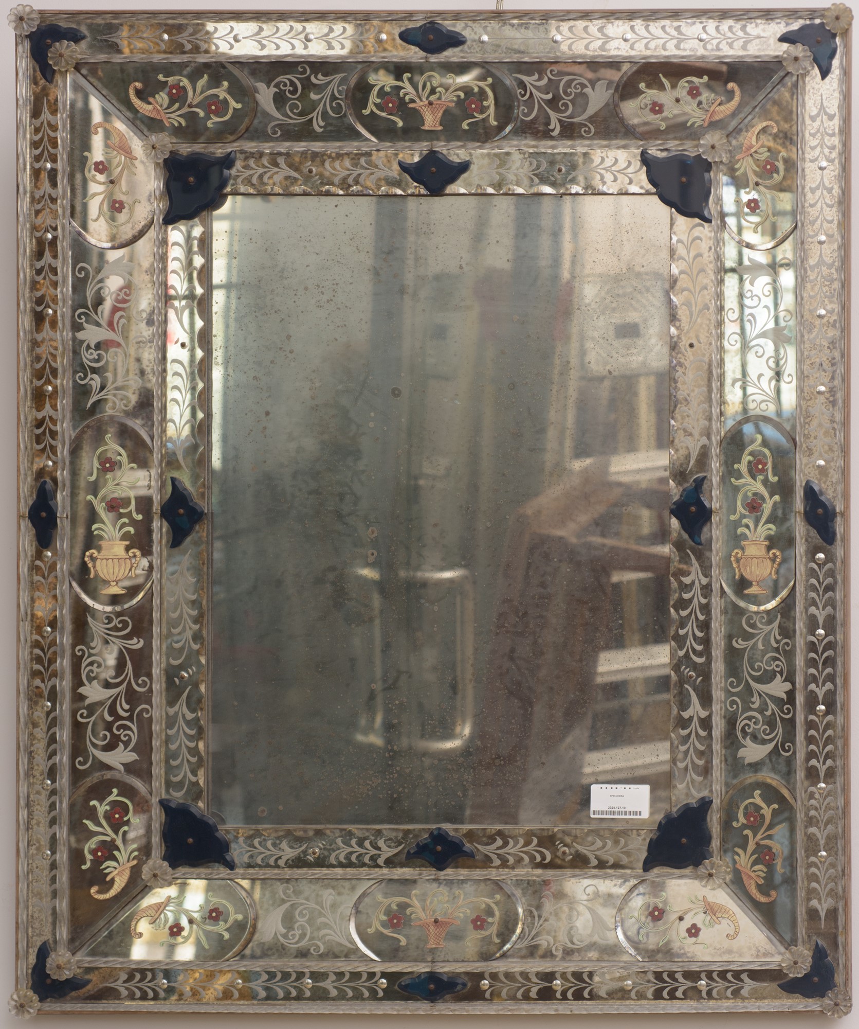 Specchiera in vetro inciso e decorato a motivi floreali con inserti color cobalto. Manifattura veneta. Specchio d'origine.