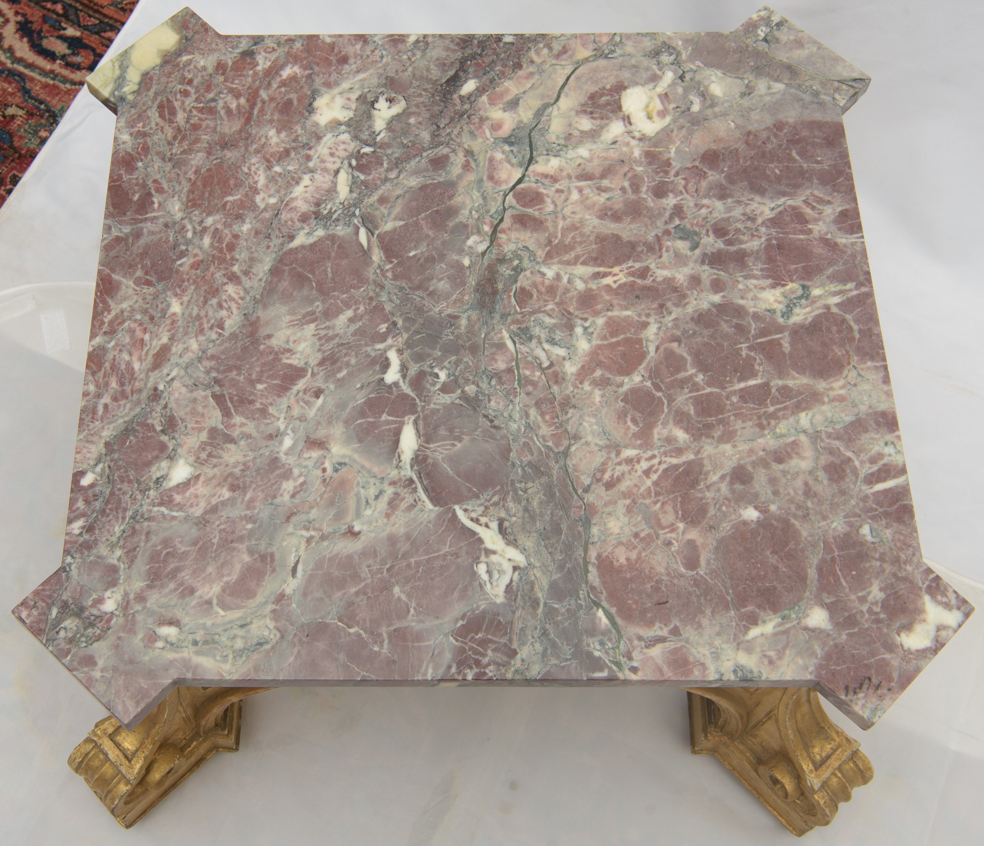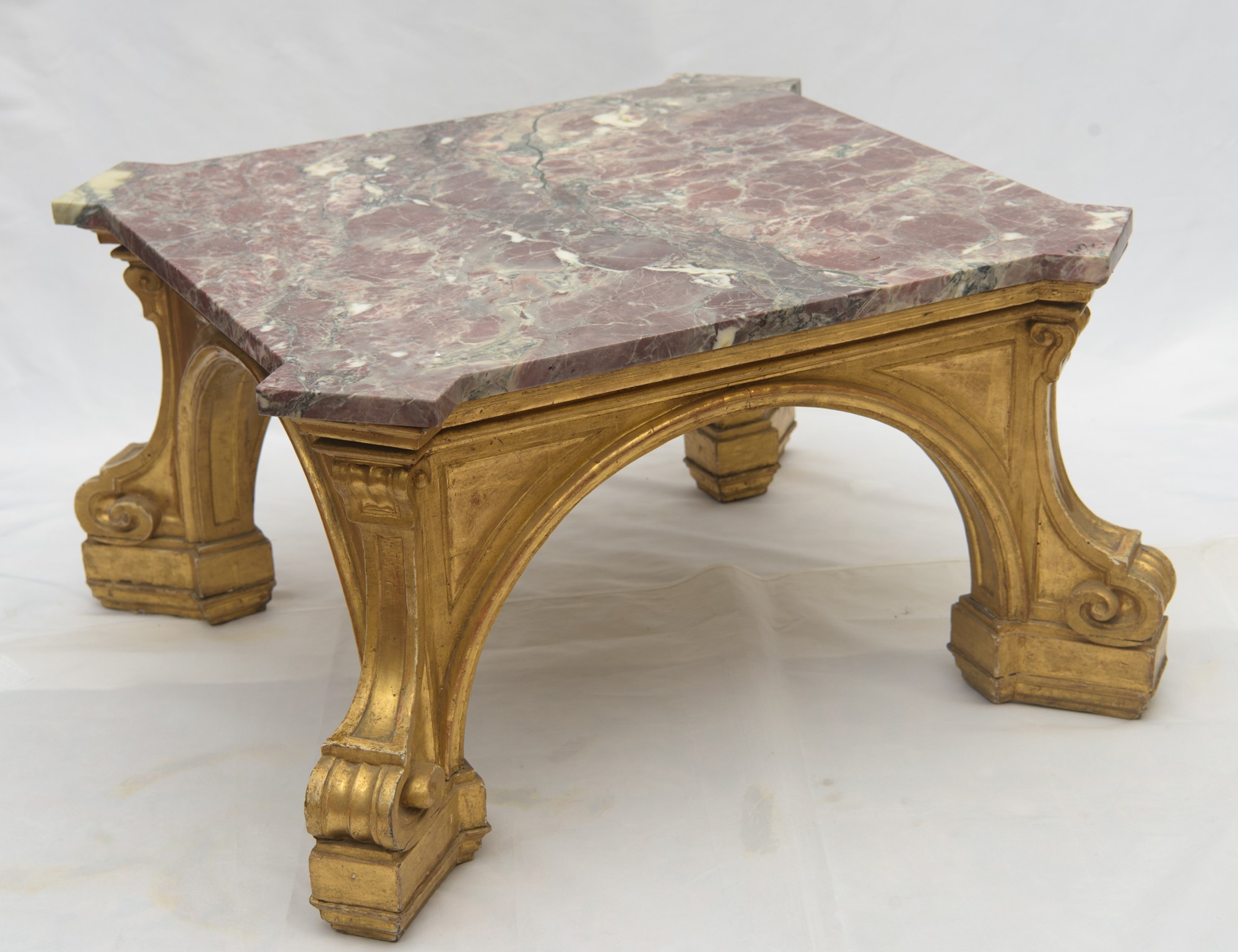 In legno dorato e intagliato, a quattro piedi con piano superiore in marmo fior di pesco. Manifattura francese.