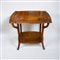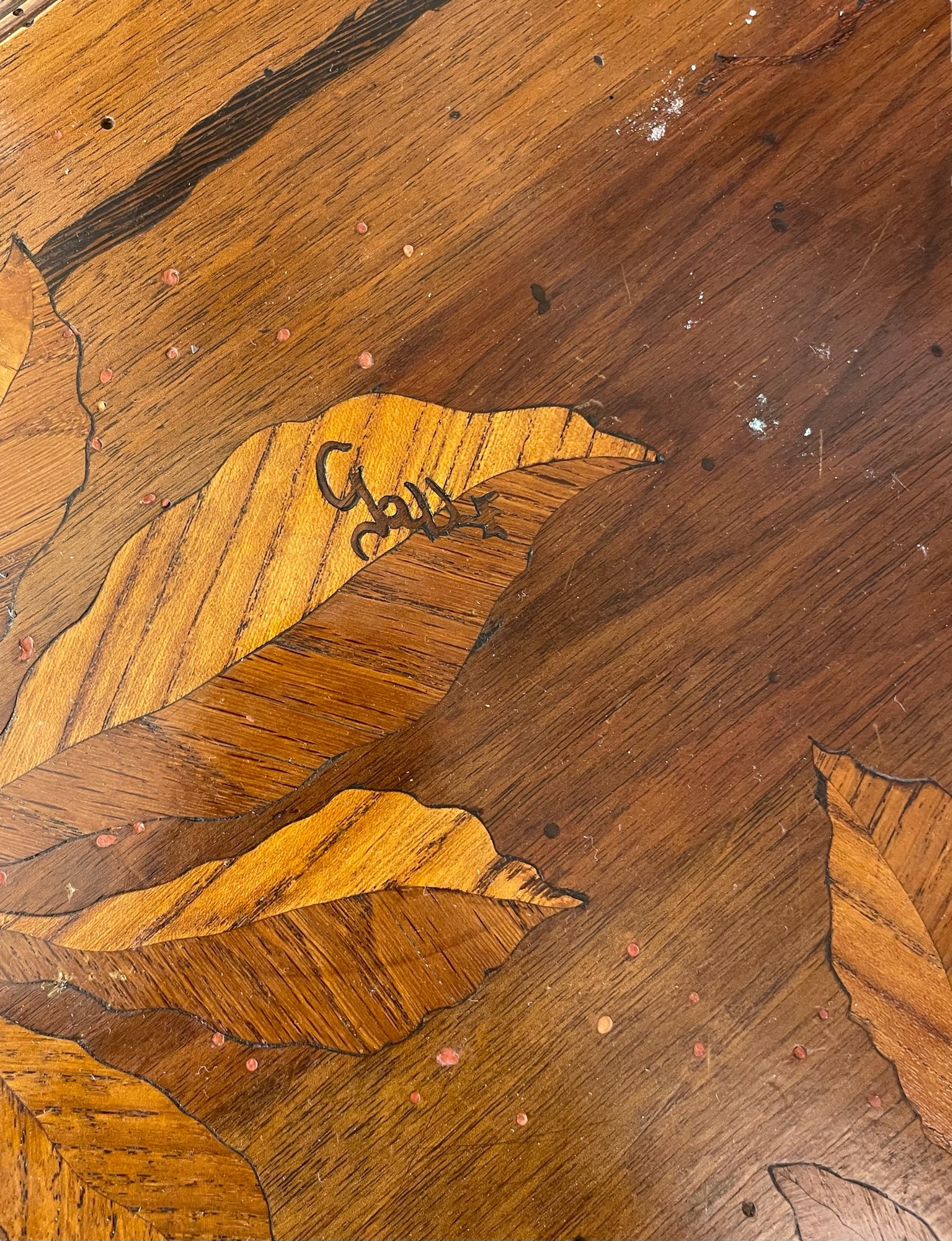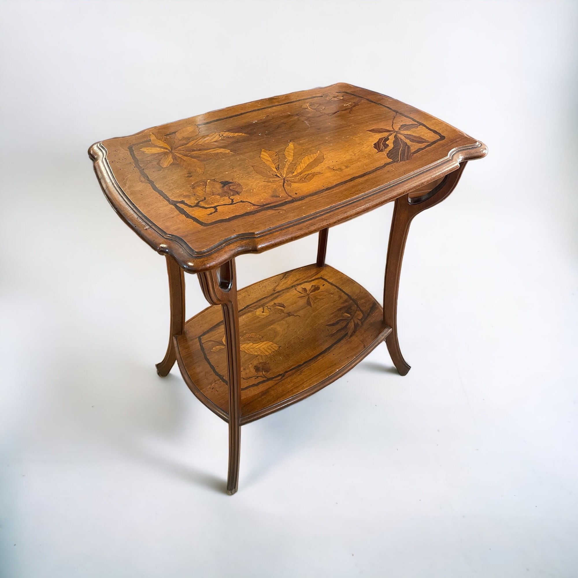 Tavolino a due ripiani con piano superiore centinato, in legno di noce con intarsi in legni pregiati. Firmato a intarsio: Gallé.