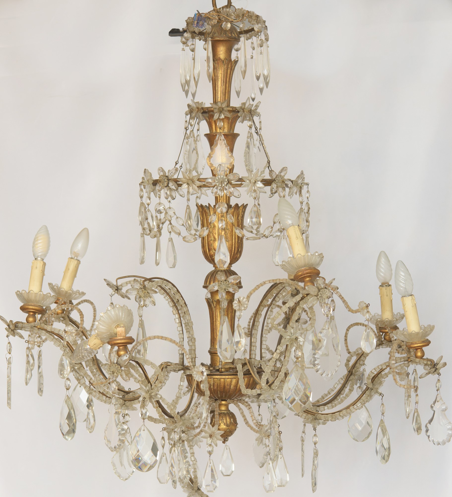 in legno dorato e intagliato con pendagli in vetro sfaccettato. Difetti e mancanze.