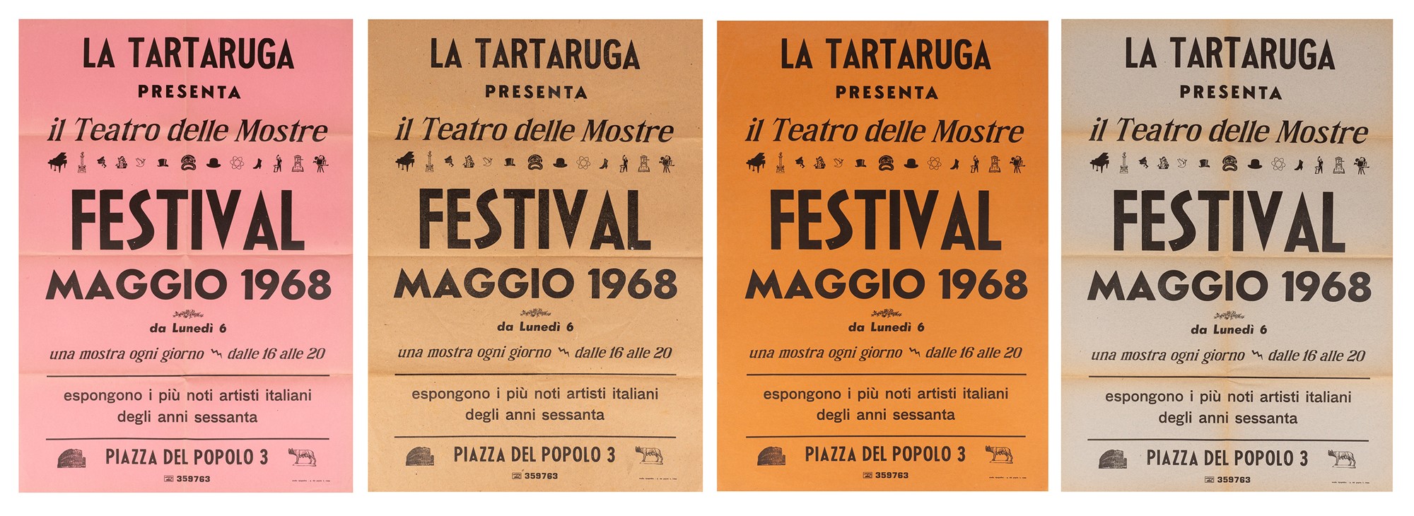 Festival maggio 1968, quattro manifesti della celebre mostra alla galleria La Tartaruga, Roma, maggio 1968, ciascuno di colore diverso, cm 70 x 50, (sc)