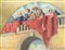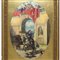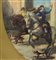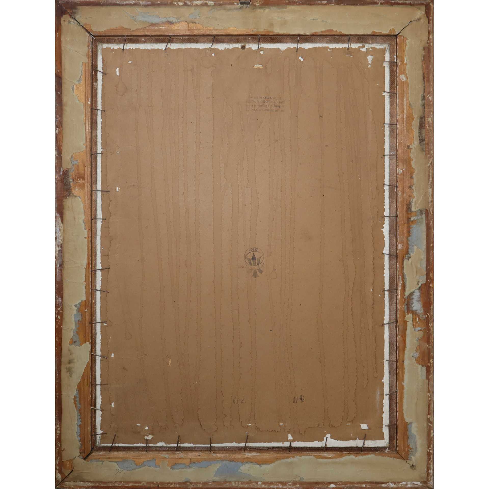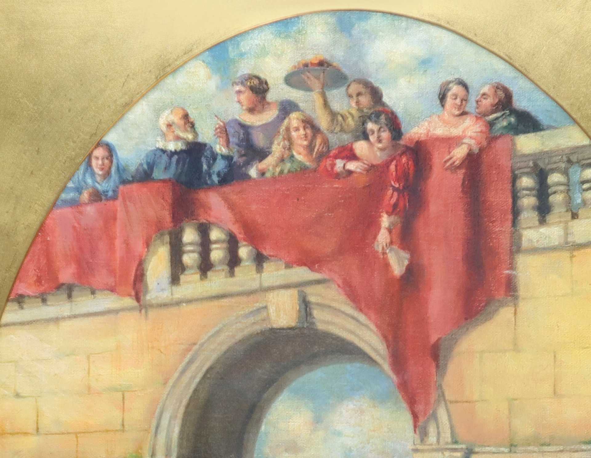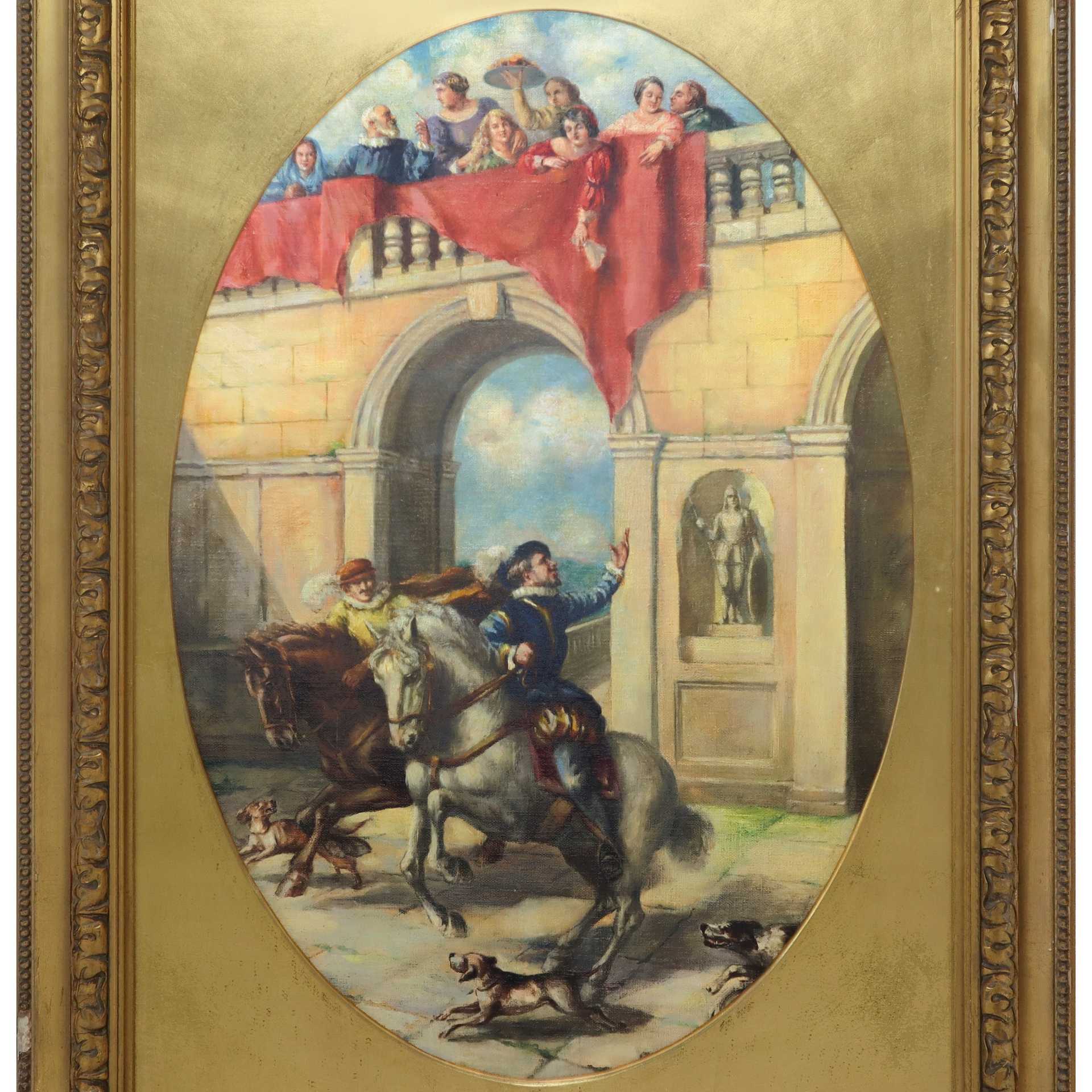 Cavaliere e donne al balcone ovale cm 45 x 65, in cornice cm 85 x 65 olio su tela applicata tavoletta