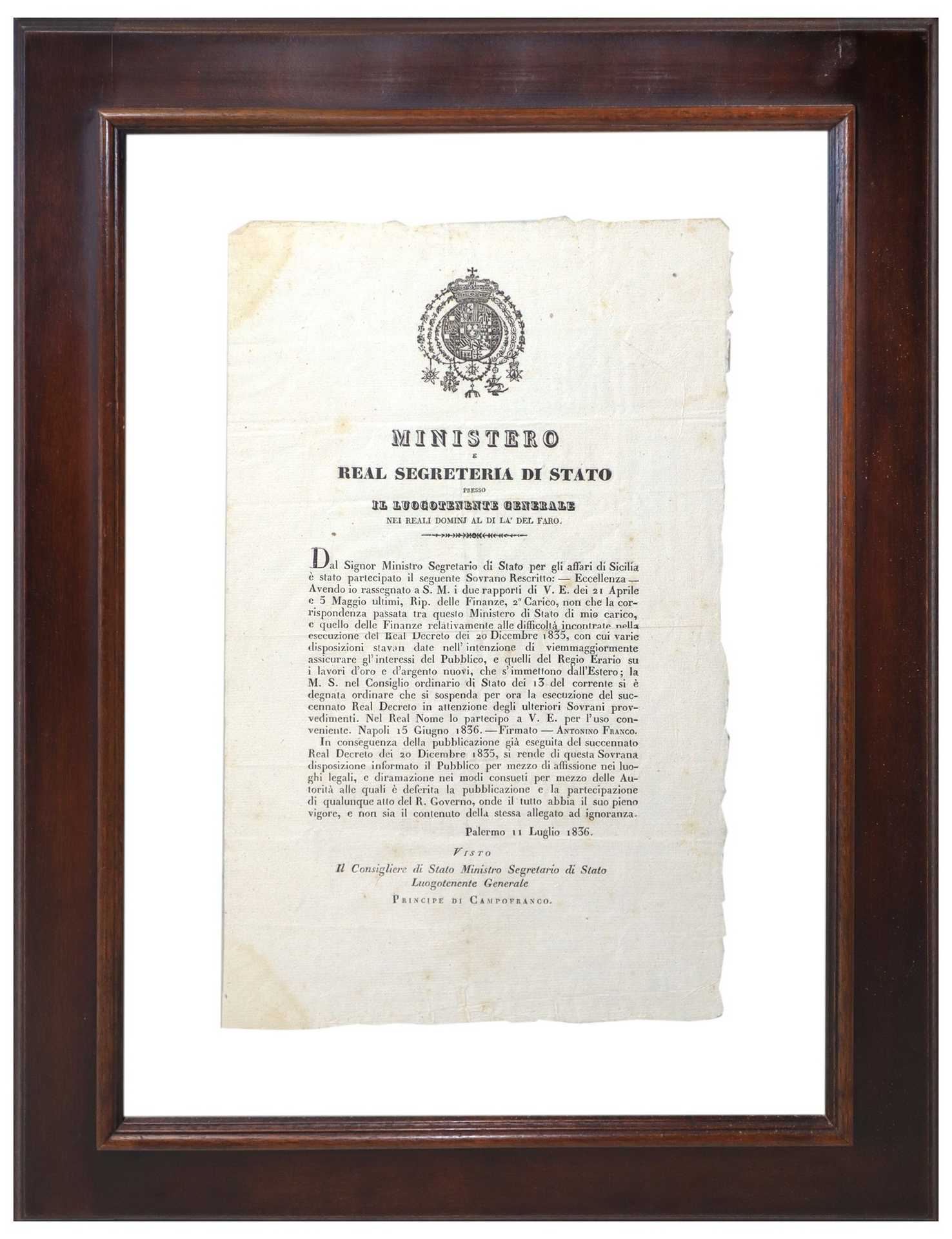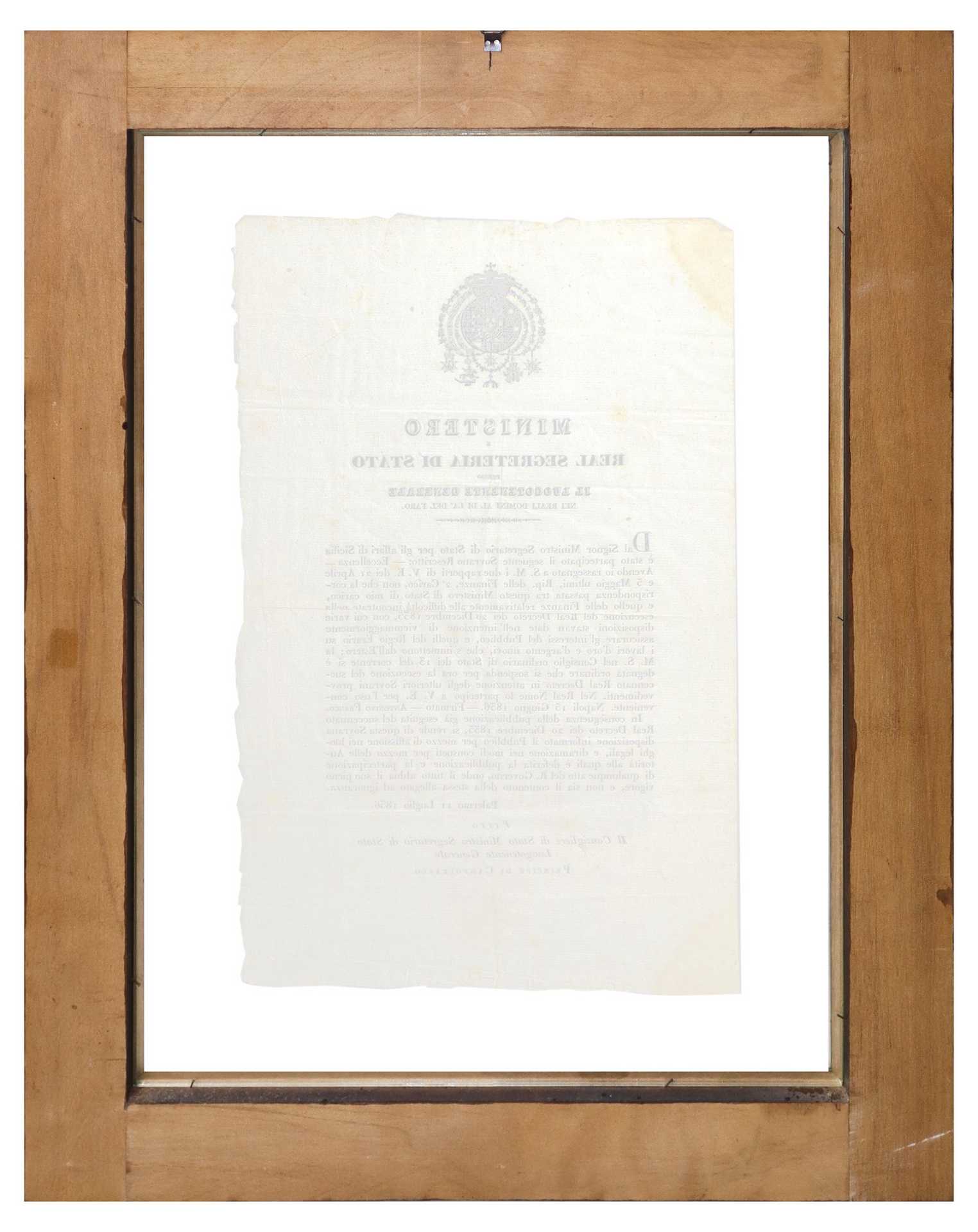 Real Decreto - Ministero e Real Segreteria di Stato, 11 July 1836 in cornice h cm 62 x cm 45 ; senza cornice h cm 49 x cm 34