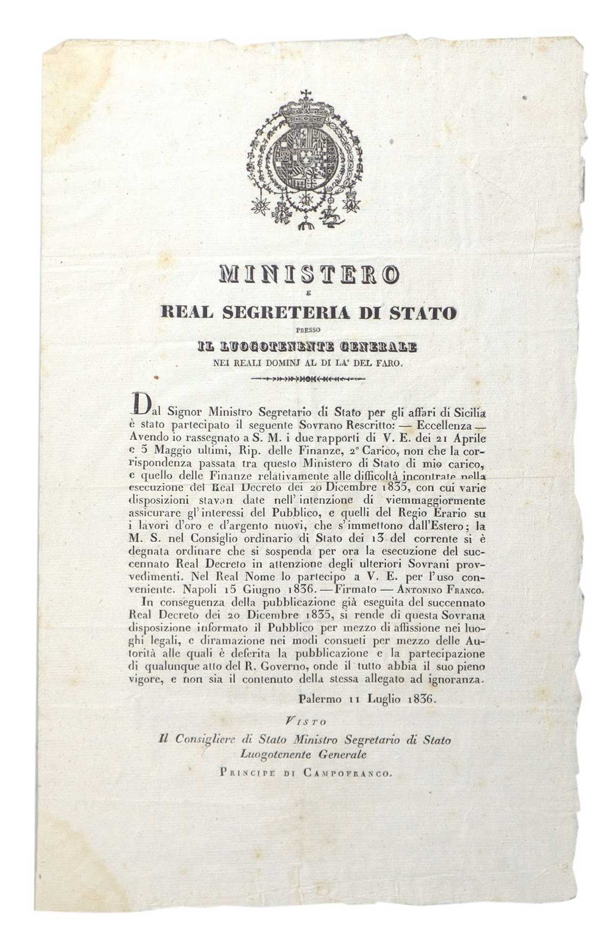 Real Decreto - Ministero e Real Segreteria di Stato, 11 July 1836