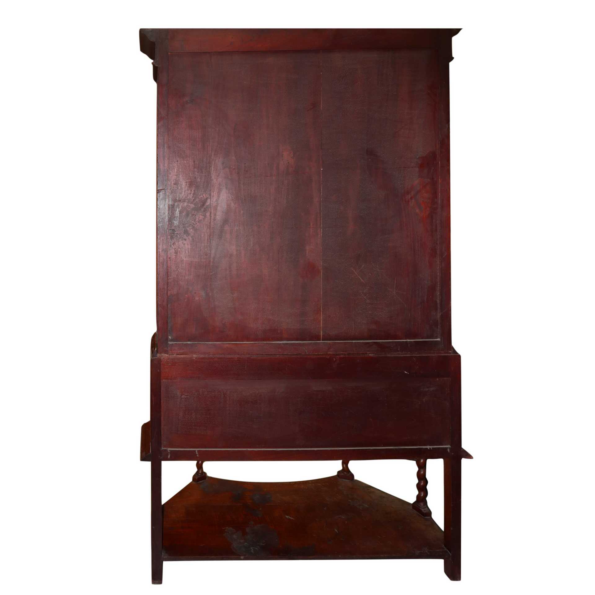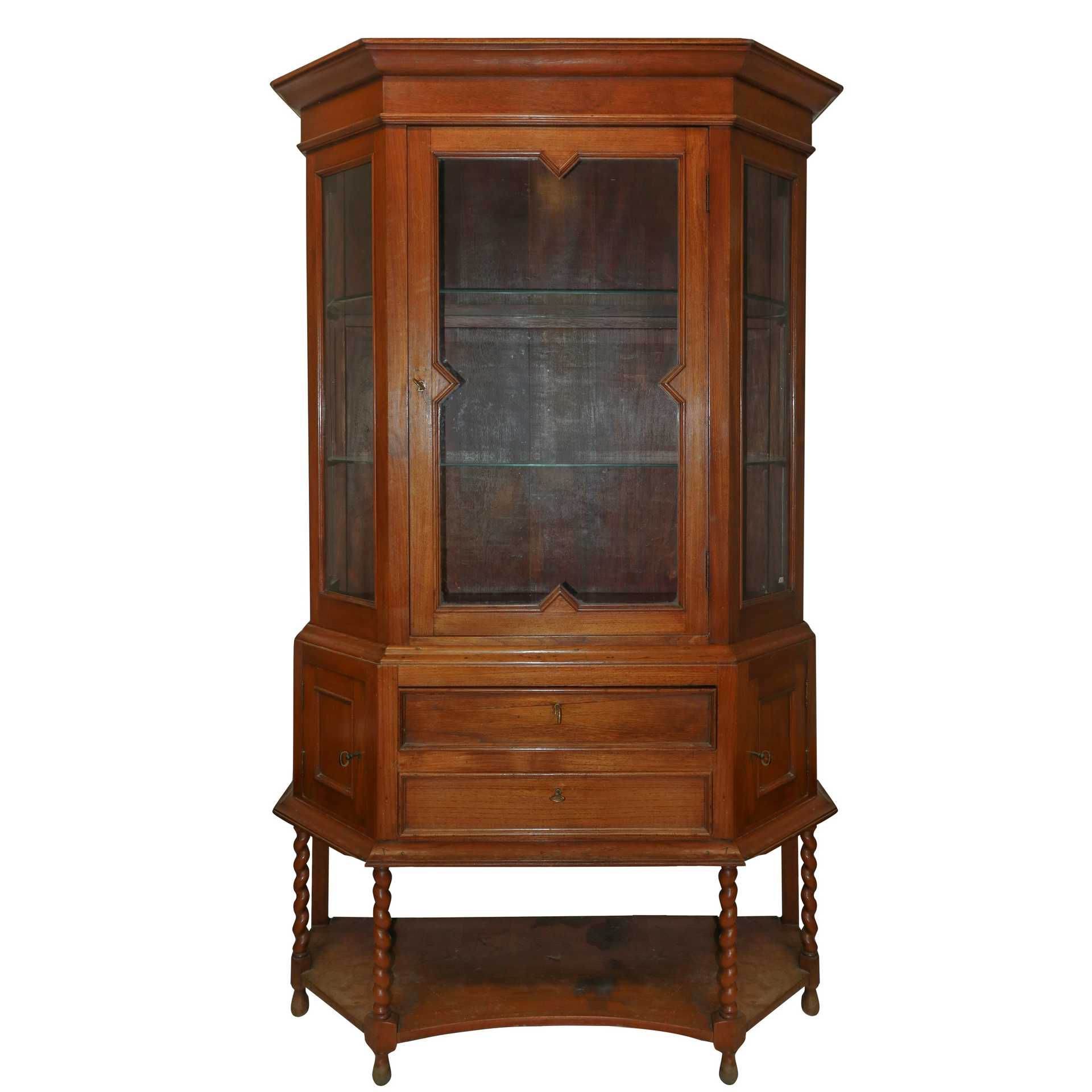 Vetrina due corpi, 19th/20° secolo H 196 L 120 x 47 P Parte superiore un anta , due mensole in vetro parte inferiore due cassetti centrali più due angolari base a giorno con colonnine a torchon .Parte superiore un anta , due mensole in vetro parte inferiore due cassetti centrali più due angolari base a giorno con colonnine a torchon .