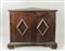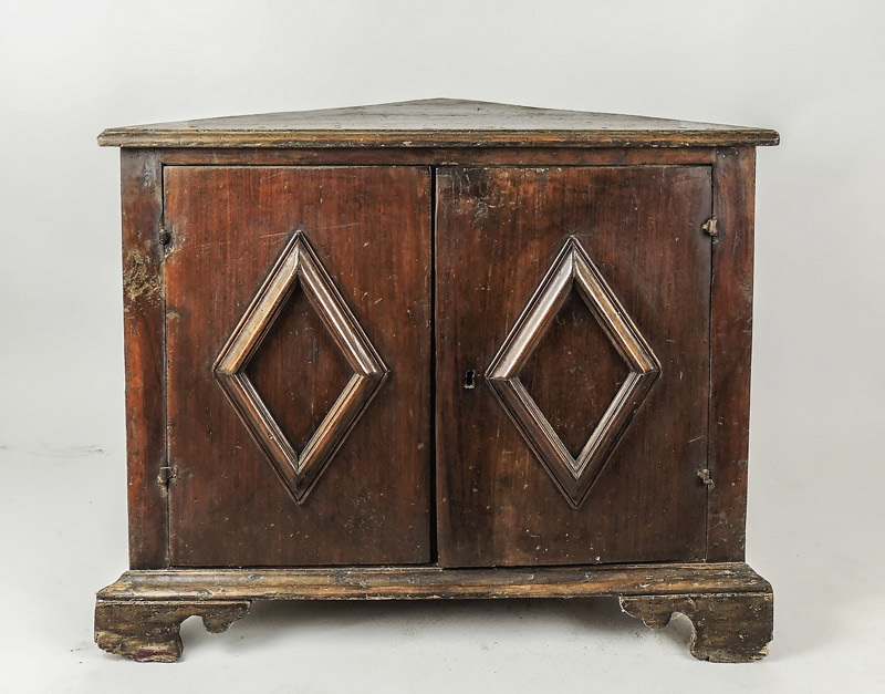 ANGOLIERA IN NOCE - WALNUT CORNEER CABINET XIX secolo - 19th Century piano con becco di civetta, fronte a due sportelli con cornici a losanga, base modanata, piedi a mensola, lievi difetti h cm 75x95x64