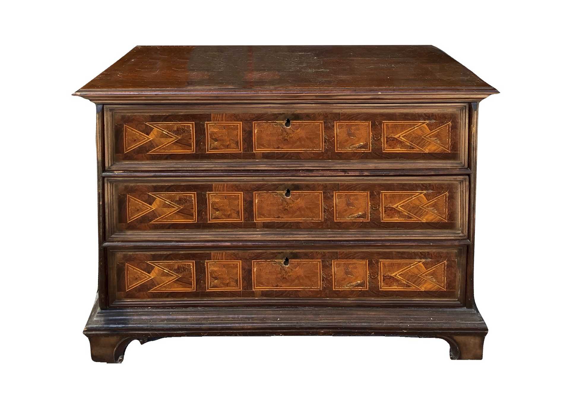 Cassettone in legno di palissandro con intarsi geometrici in legno chiaro sul fronte, Nineteen° secolo