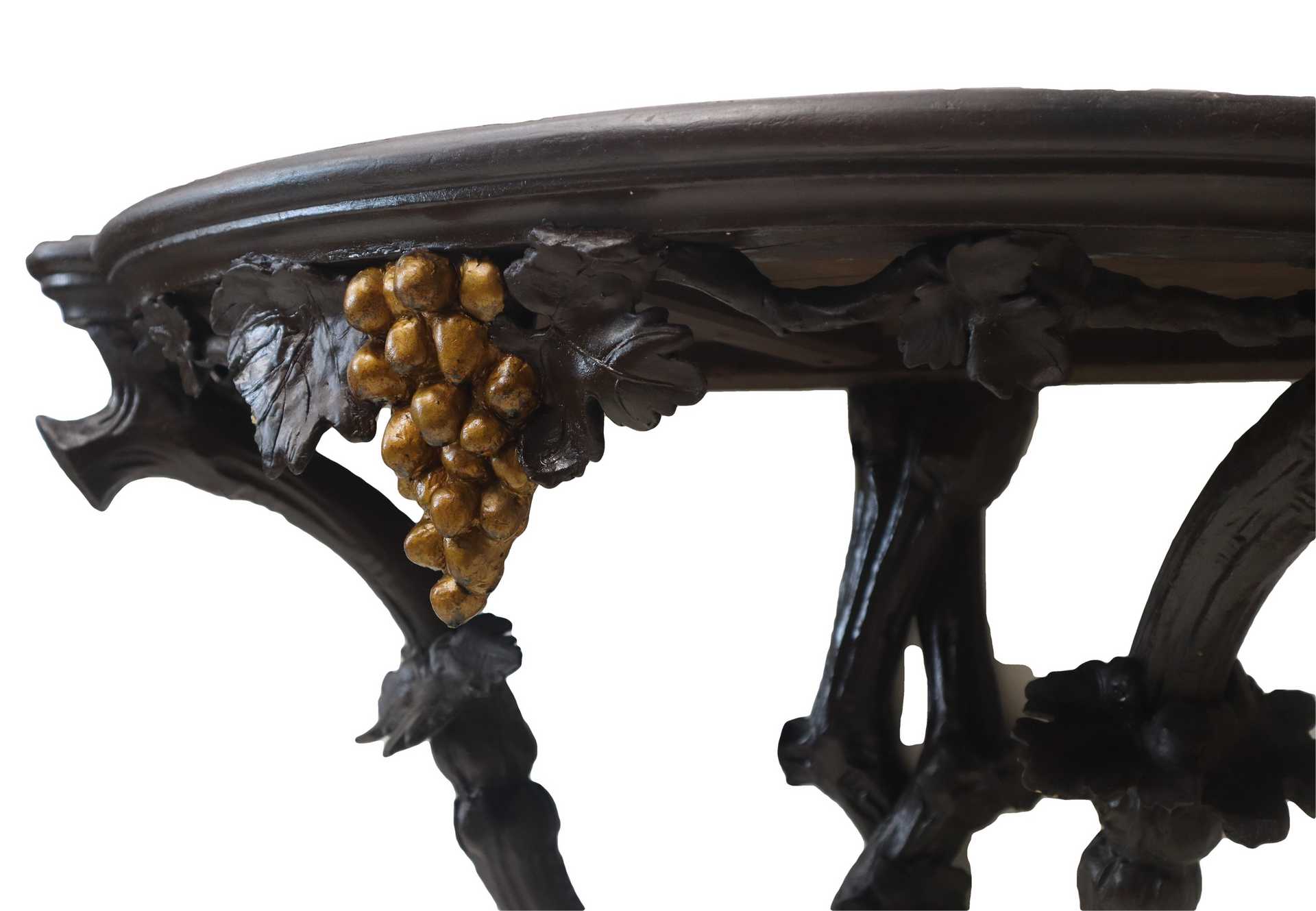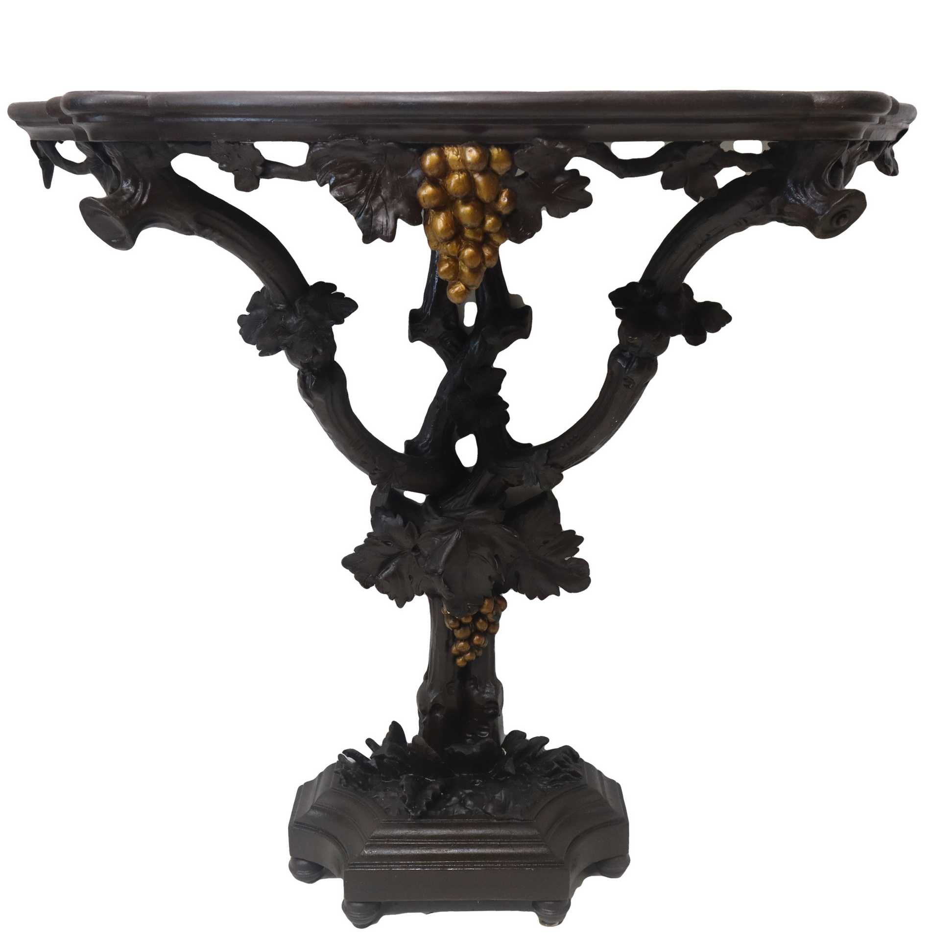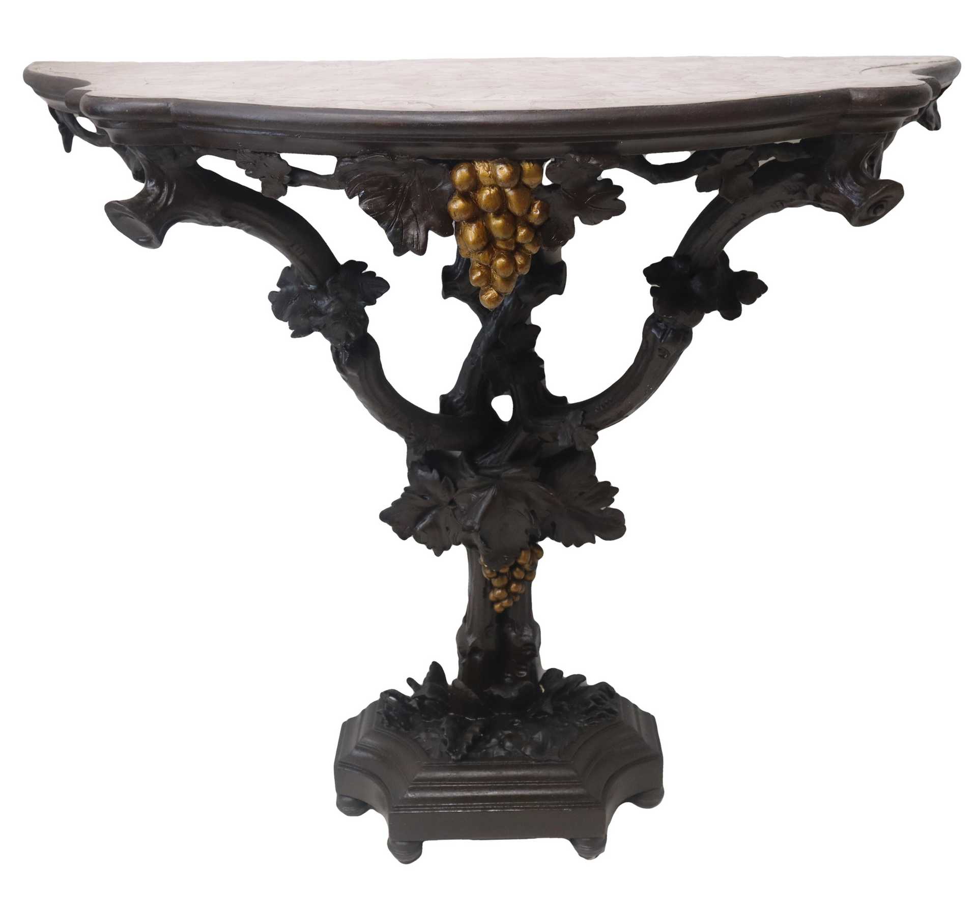 Console in legno intagliato a foglie di vite., Venice, Fine 19° secolo H cm 100 x L cm 107 x P cm 48 Parti dorate, piano laccato in finto marmo. Presenti rotture ed incollatureParti dorate, piano laccato in finto marmo. Presenti rotture ed incollature