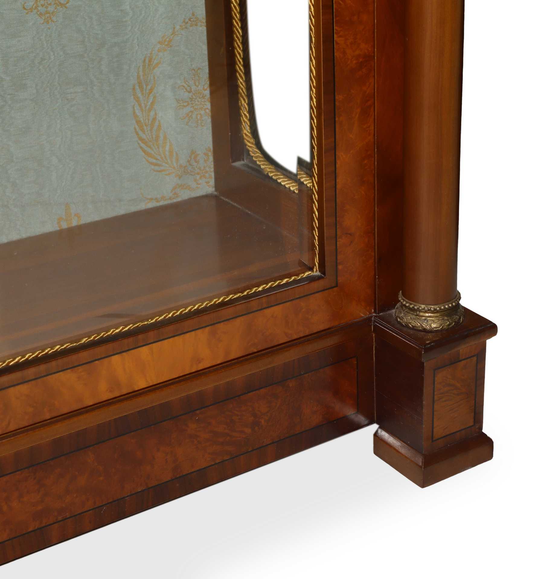 Vetrina nello stile Biedermeier in legno di acero con perfili bois de rose, colonne con base e capitelli dorati ai lati, sormontata da timpano, Primi 20° secolo