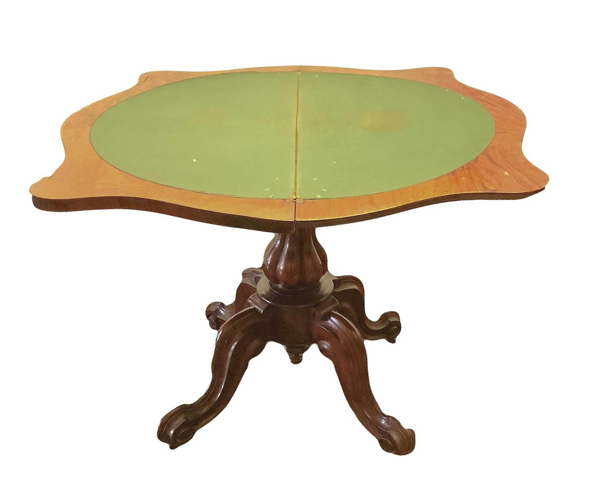 Tavolo da gioco con piano in radica, piedi a quattro razze con sostegno baccellato, nineteen° secolo