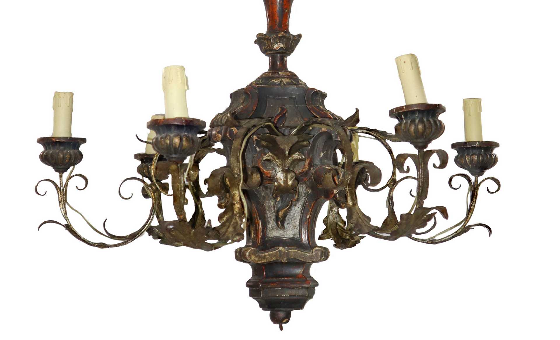 Lampadario a 6 luci con stelo in legno scolpito e bracci in metallo dorato sagomati a foglie