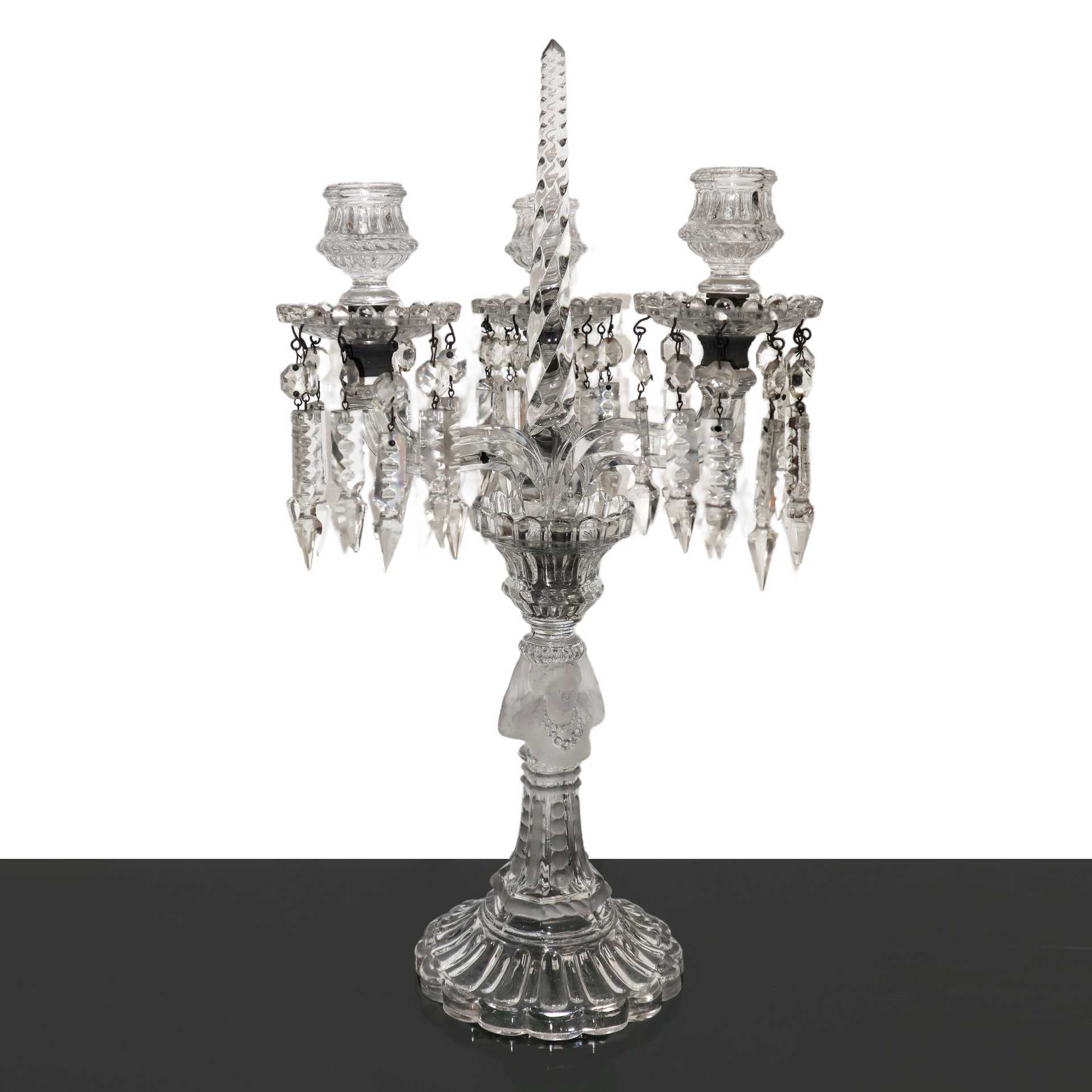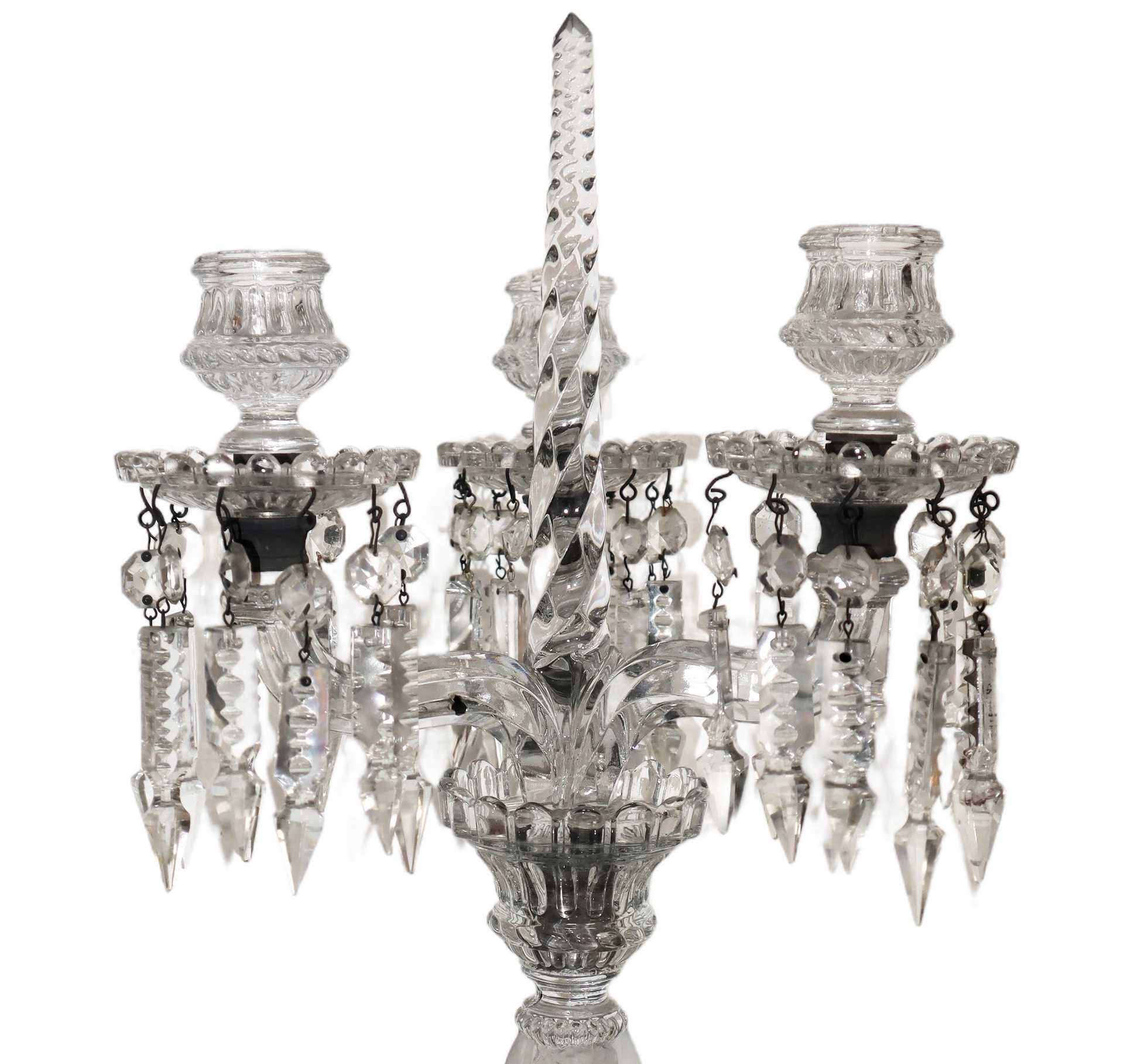 Candelabro in cristallo a tre luci in vetro di murano, 19° secolo H cm 45 Con brindoli pendenti Con brindoli pendenti