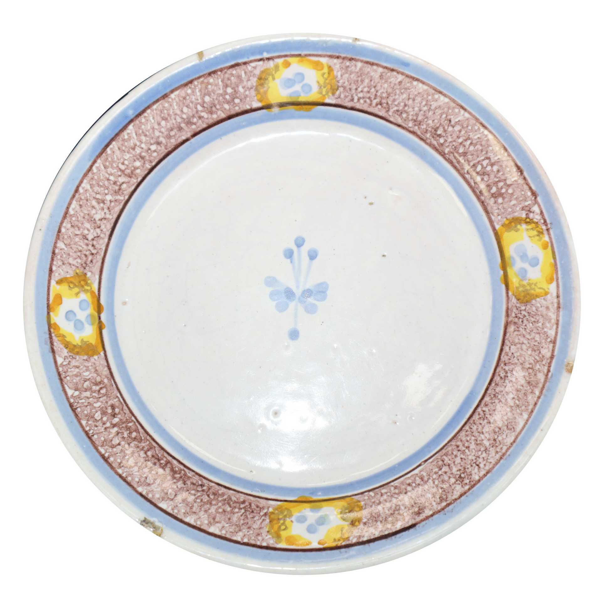 Coppia di piattini in maiolica di Caltagirone, circonferenza in manganese con fiori giallo e azzurro, fiore al centro, 20° secolo