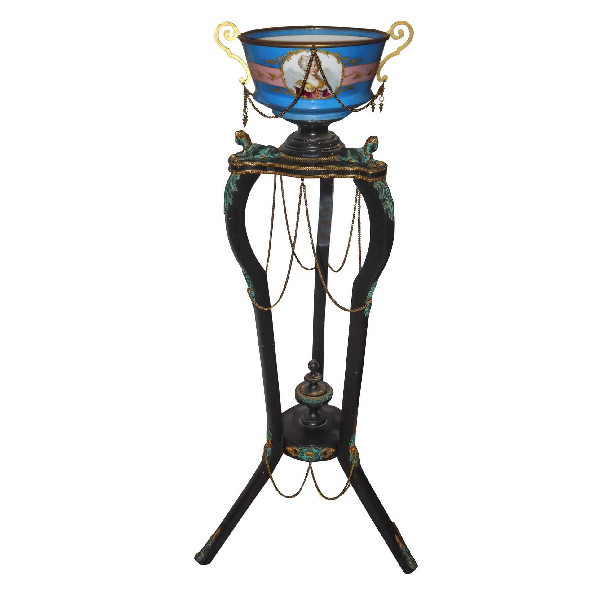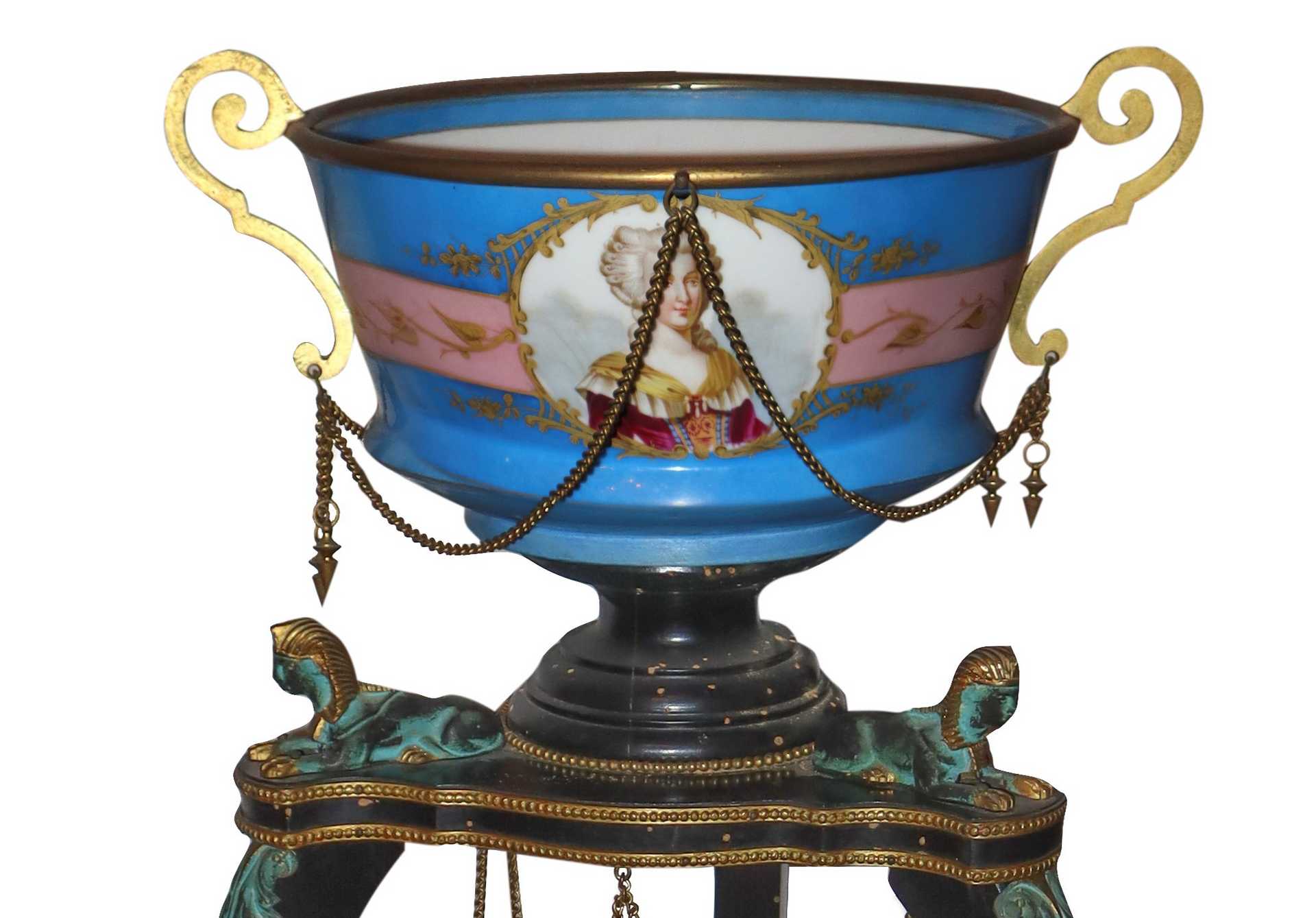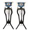 Bronzi sormontati da vasi in porcellana nei toni del azzurro di sevres, con sul fronte figure femminili.