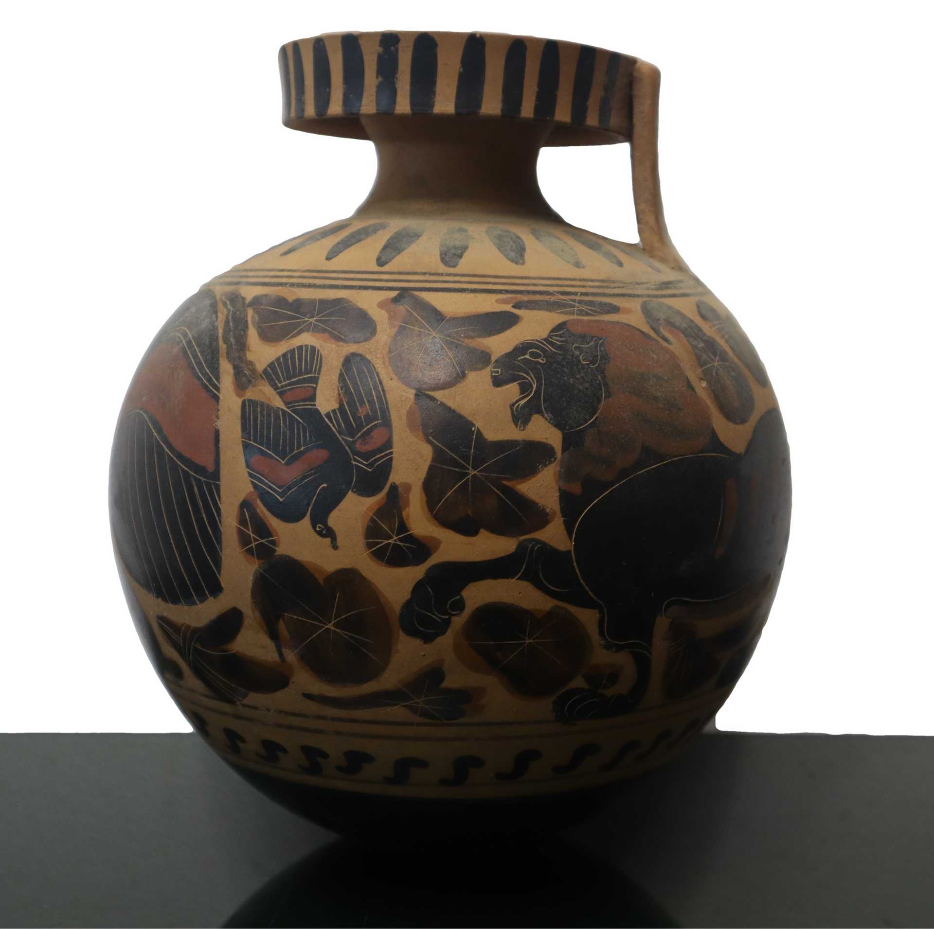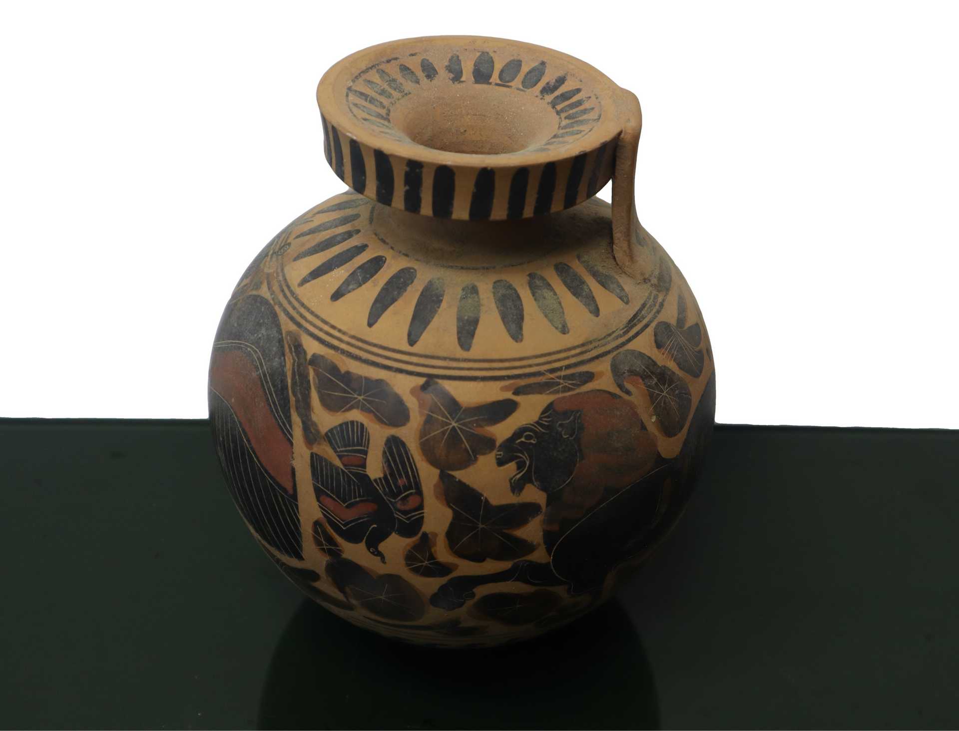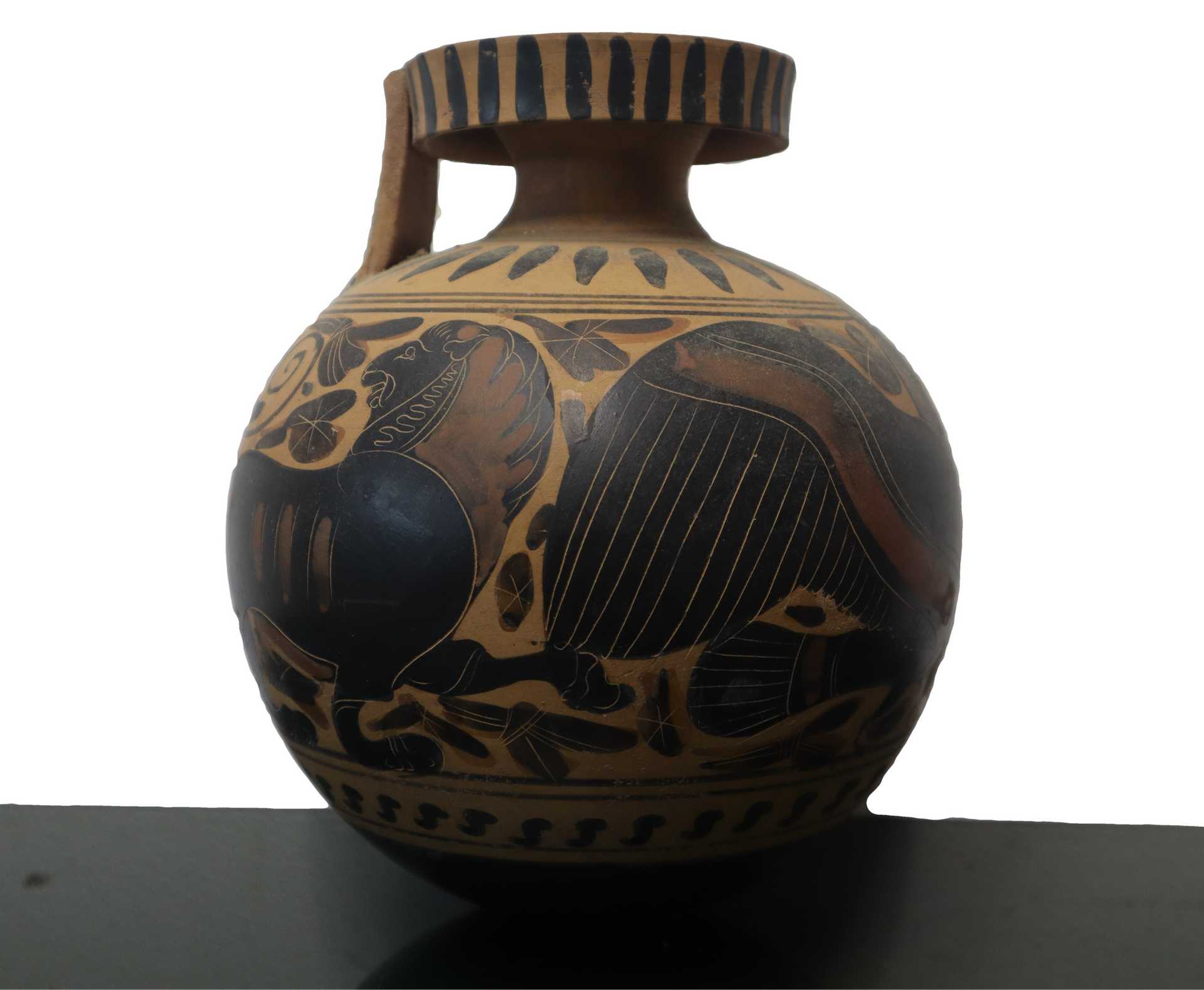 Riproduzione Ariballo. Commerciabile giusto parere Soprintendenza per i beni culturali ed ambientali di Catania del 13/12/22 N° protocollo 19871 h cm 21 terracotta dipinta Riproduzione archeologica,Vaso globulare con manico collo stretto ed ampio collo piatto. Anza sull'orlo e sulla spalla. Raffigurazioni mitilogiche. Commerciabili giusto parere Soprintendenza per i beni culturali ed ambientali di Catania del 13/12/22 N° protocollo 19871