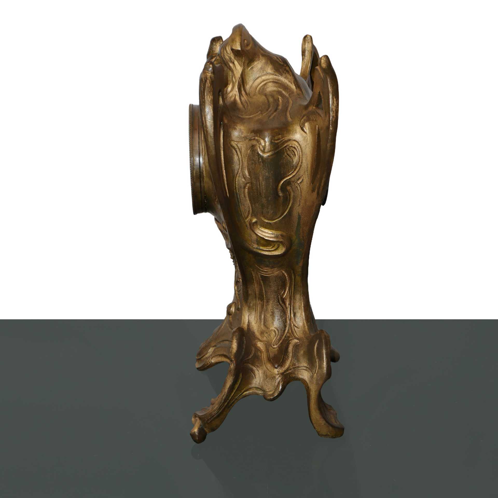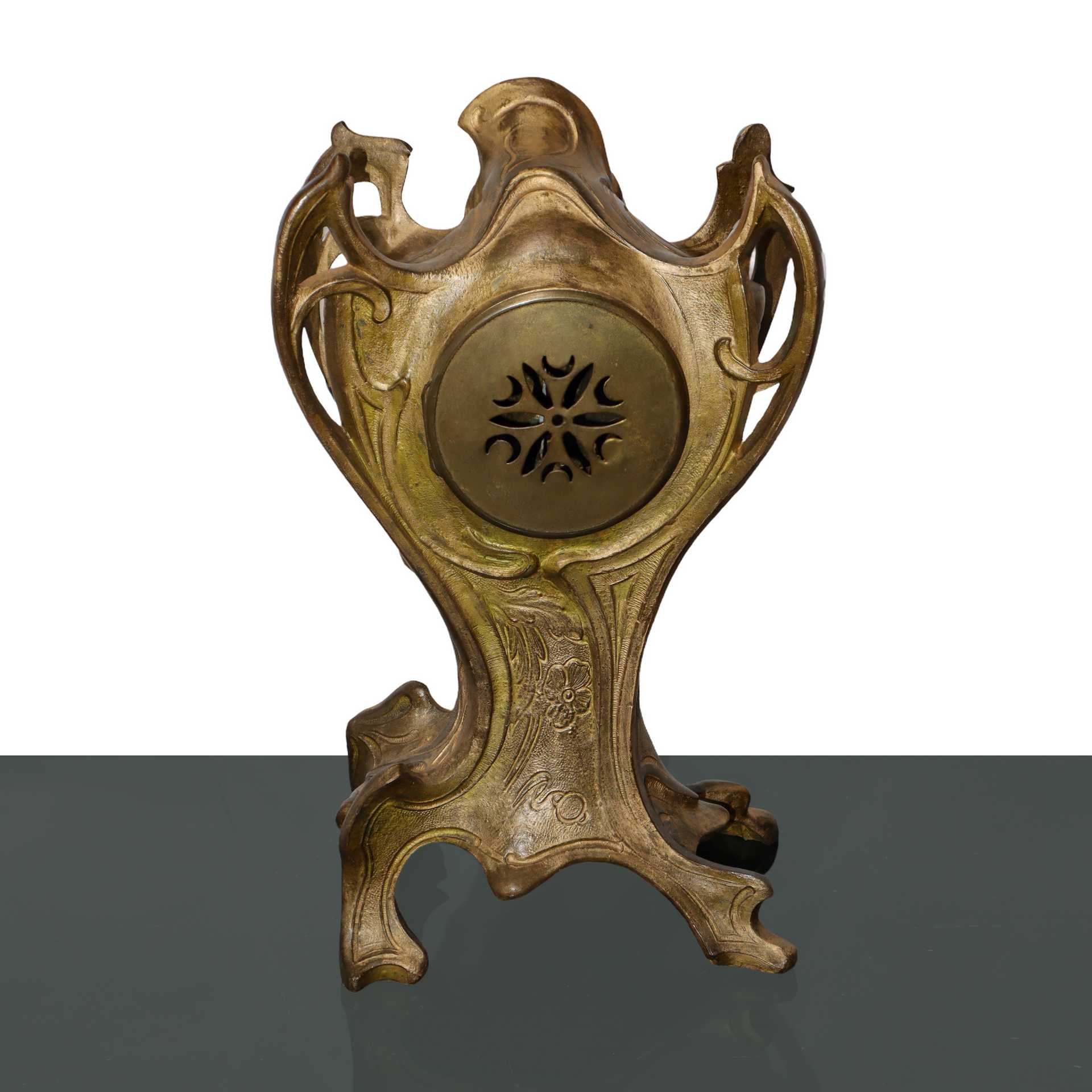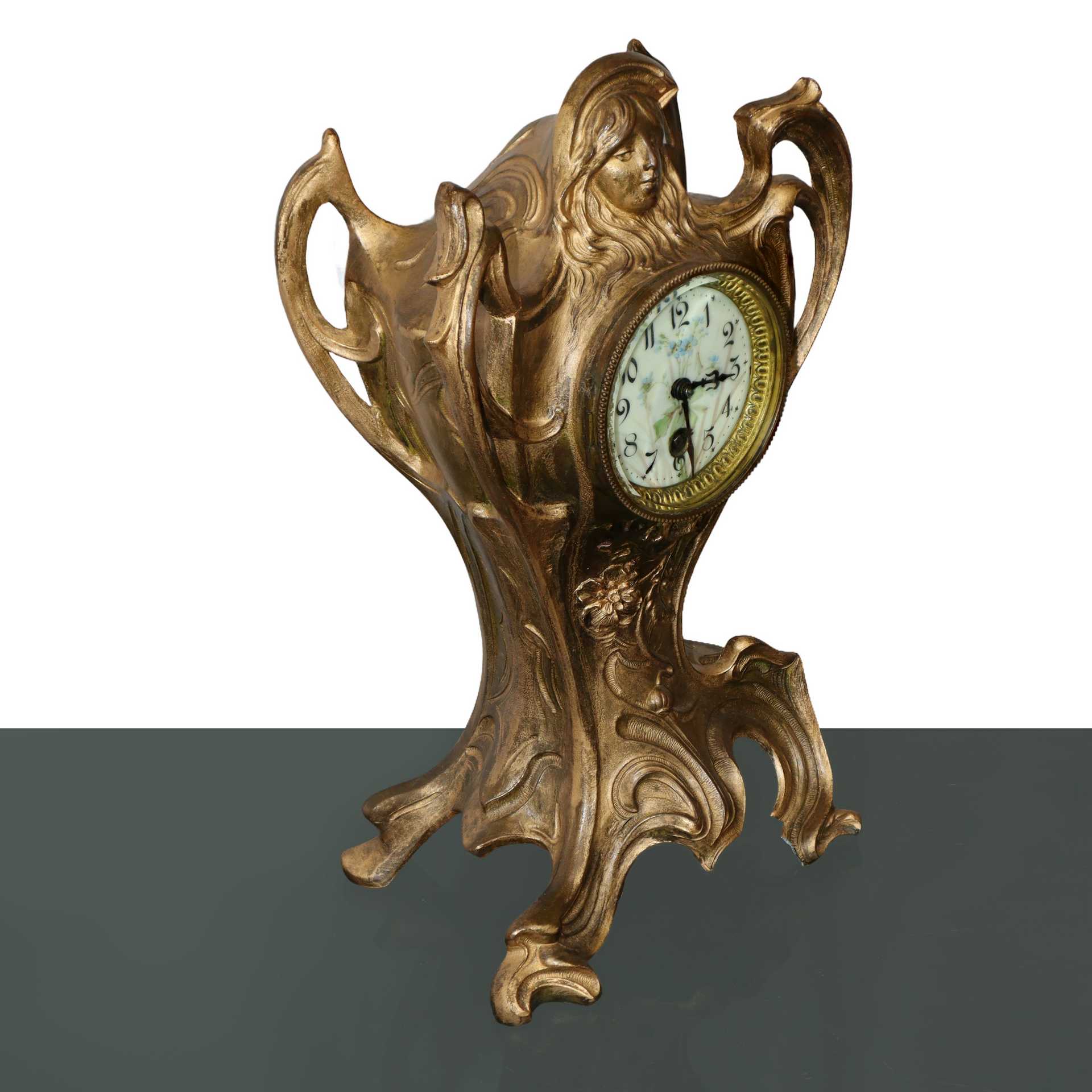 Lotto 167 | Orologio da tavolo art nuveau floreale in metallo dorato, quadrante in porcellana smaltata con figura femminile in rilievo sula cimasa