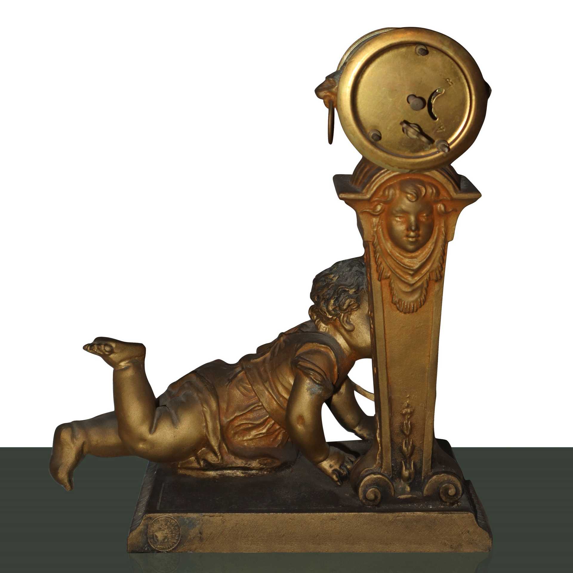 Orologio con bambino che beve alla fonte, 19° secolo H 24 x 16 x 10 Da revisionare.Da revisionare.