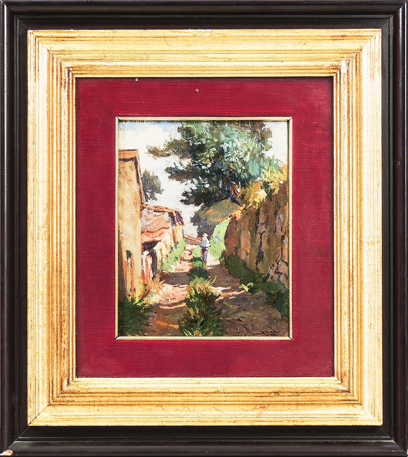 GIORGIO LUXARDO Rosignano Marittima - Rosignano View olio su tavoletta - oil on panel, firmato, al verso firmato e titolato, in cornice cm 19x14 Al verso reca cartiglio Galleria d'Arte Alcyone Firenze - With label on reverse