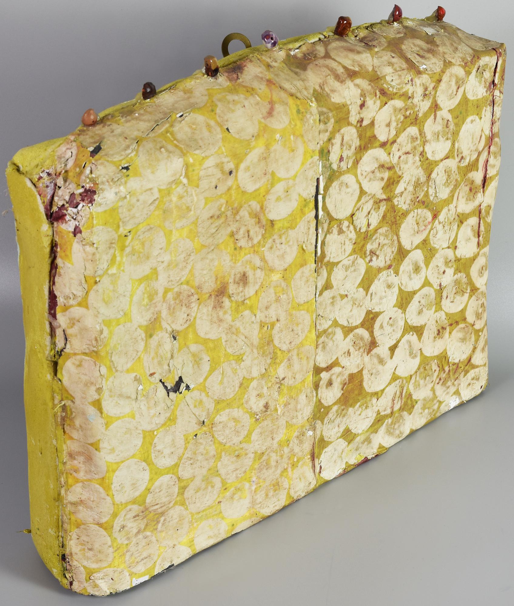 tempera, stoffa, ceramica e cera applicati su legno, cm 37x43x10