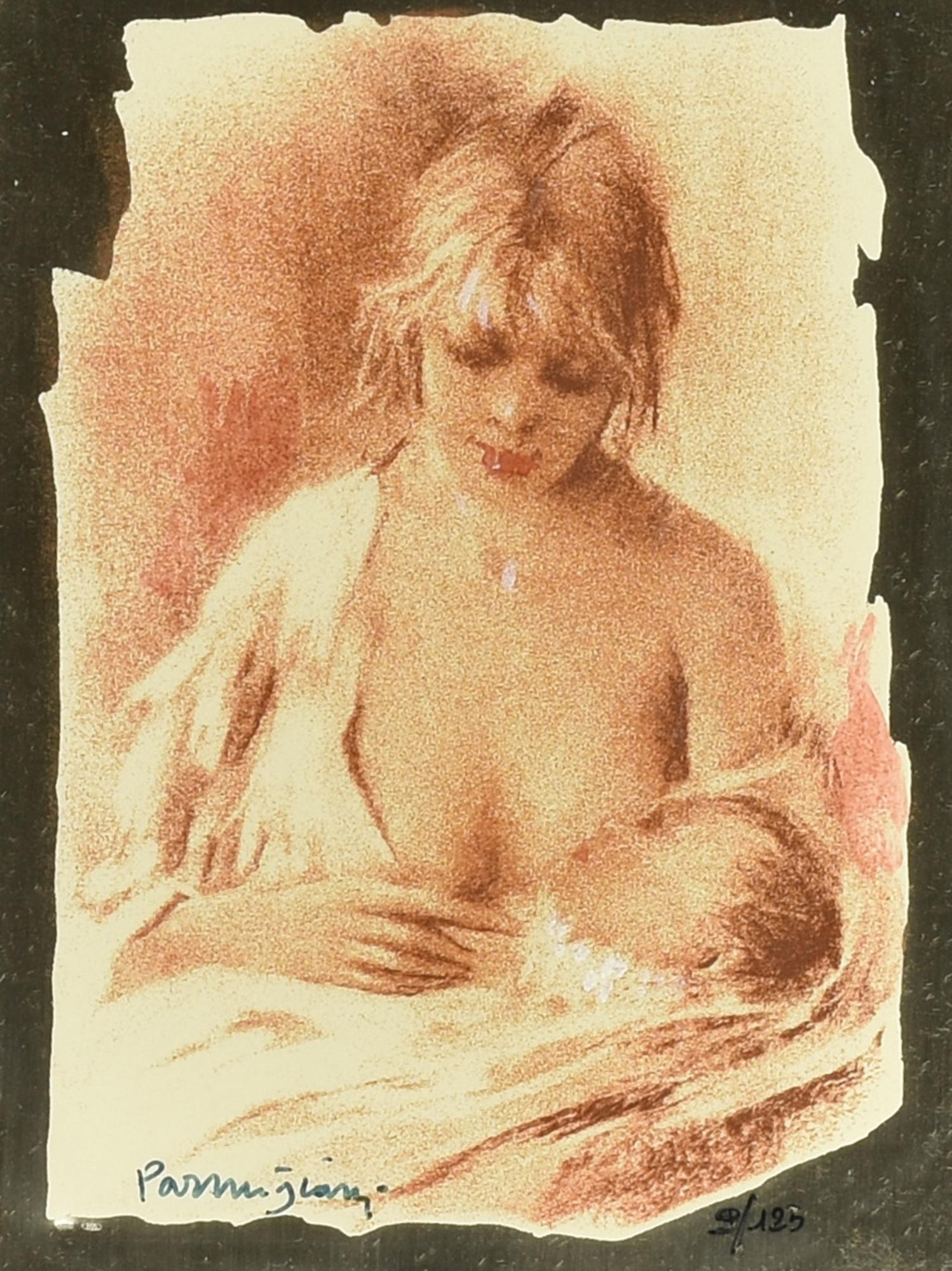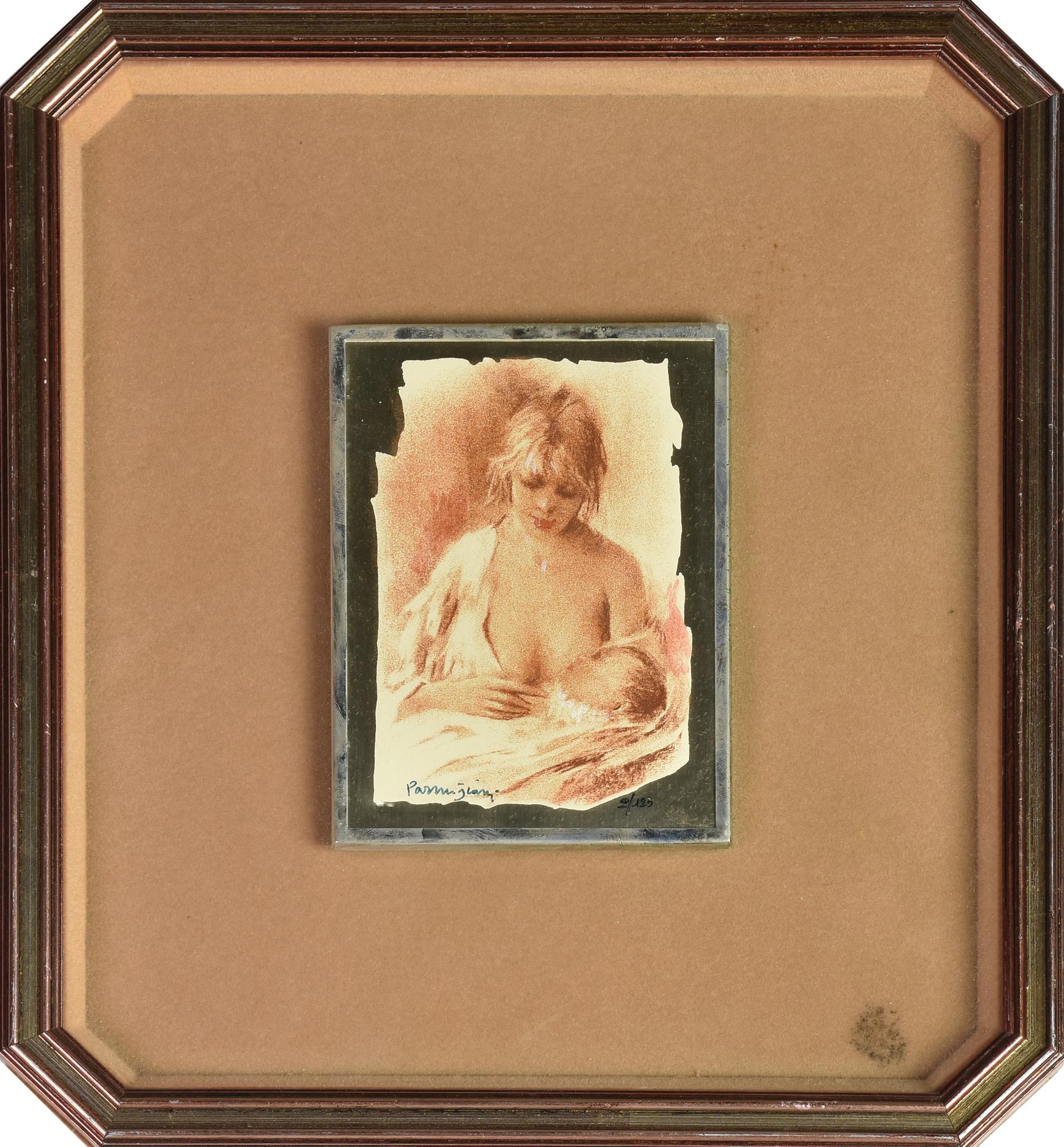 Aldo Parmigiani MATERNITA' stampa su lamina di argento 800, cm 14,5x10,5; es....