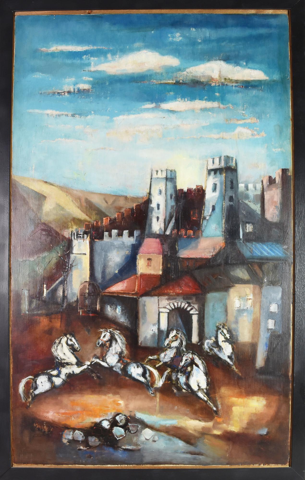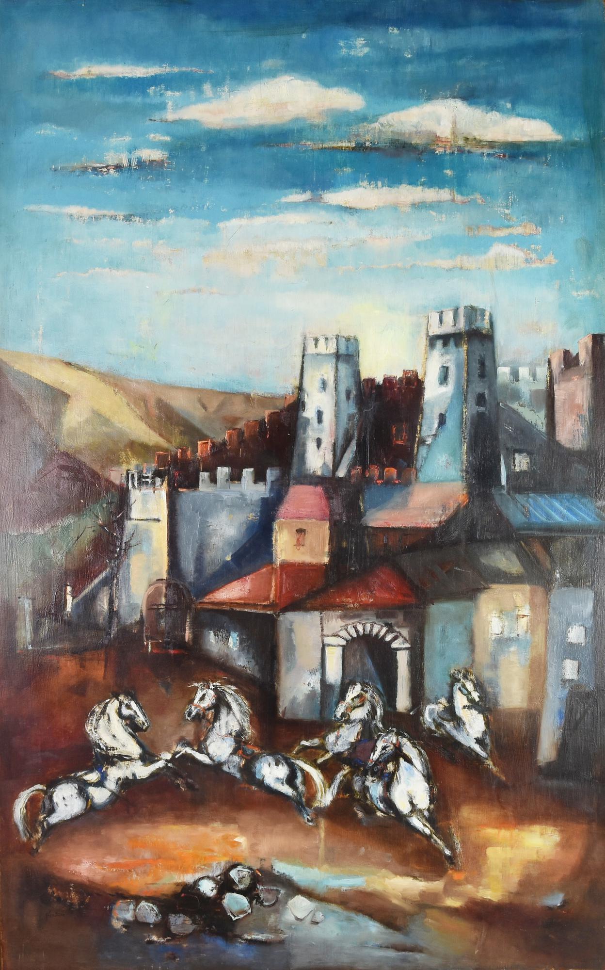 Piero Garino CASTELLO E CAVALLI olio su tavola, cm 130x75 firma L'opera e'...