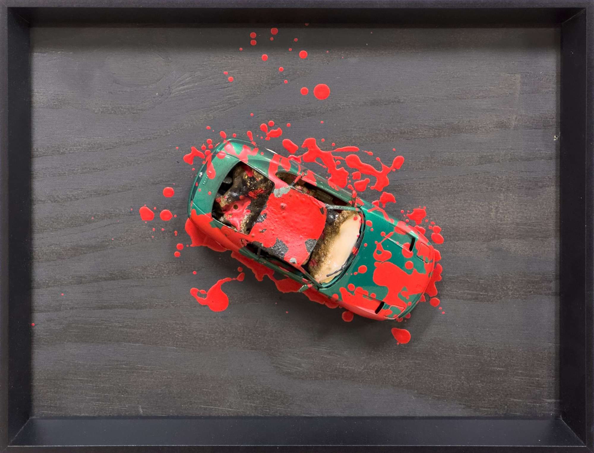 Bernard Aubertin, Voitura Brulée, 2009, modellino bruciato su tavola, 30x40...