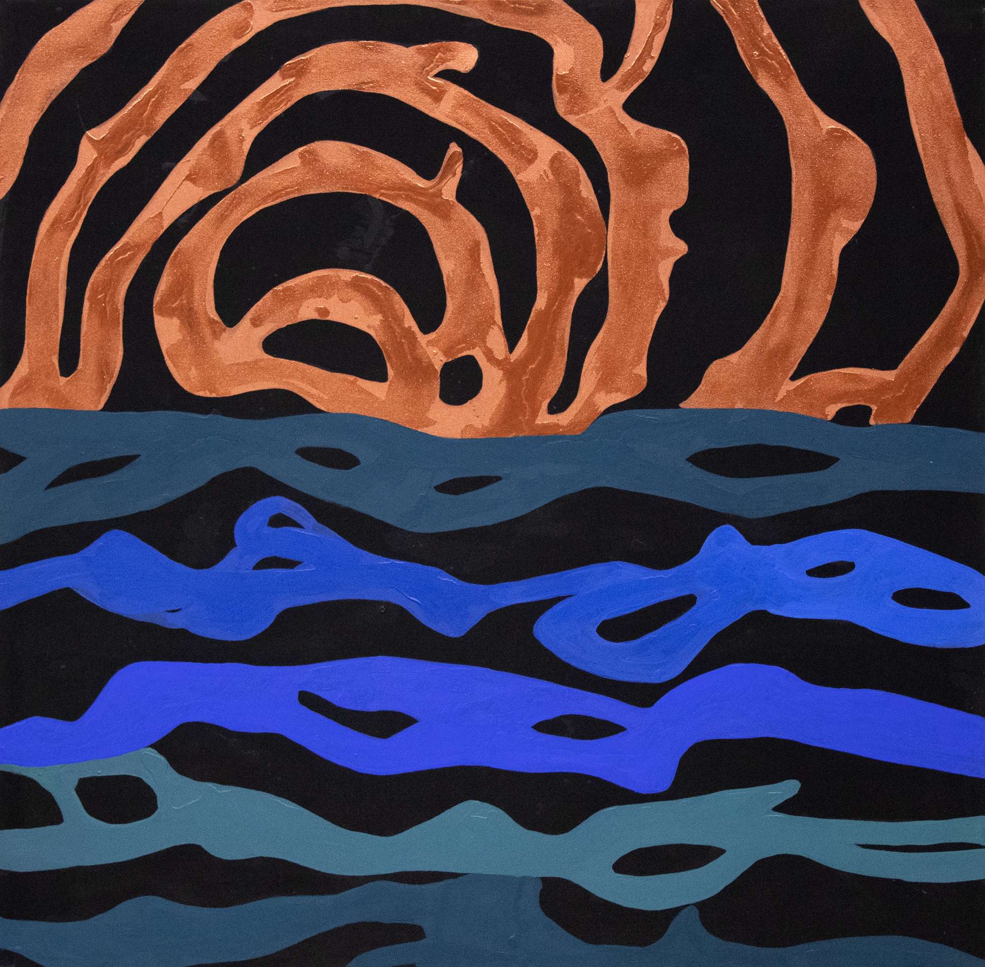 Franca Pisani, Odissea contemporanea, 2022, canvas, ossidi, foglia rame e oro, 100x100 cm, autentica a cura dell'artista