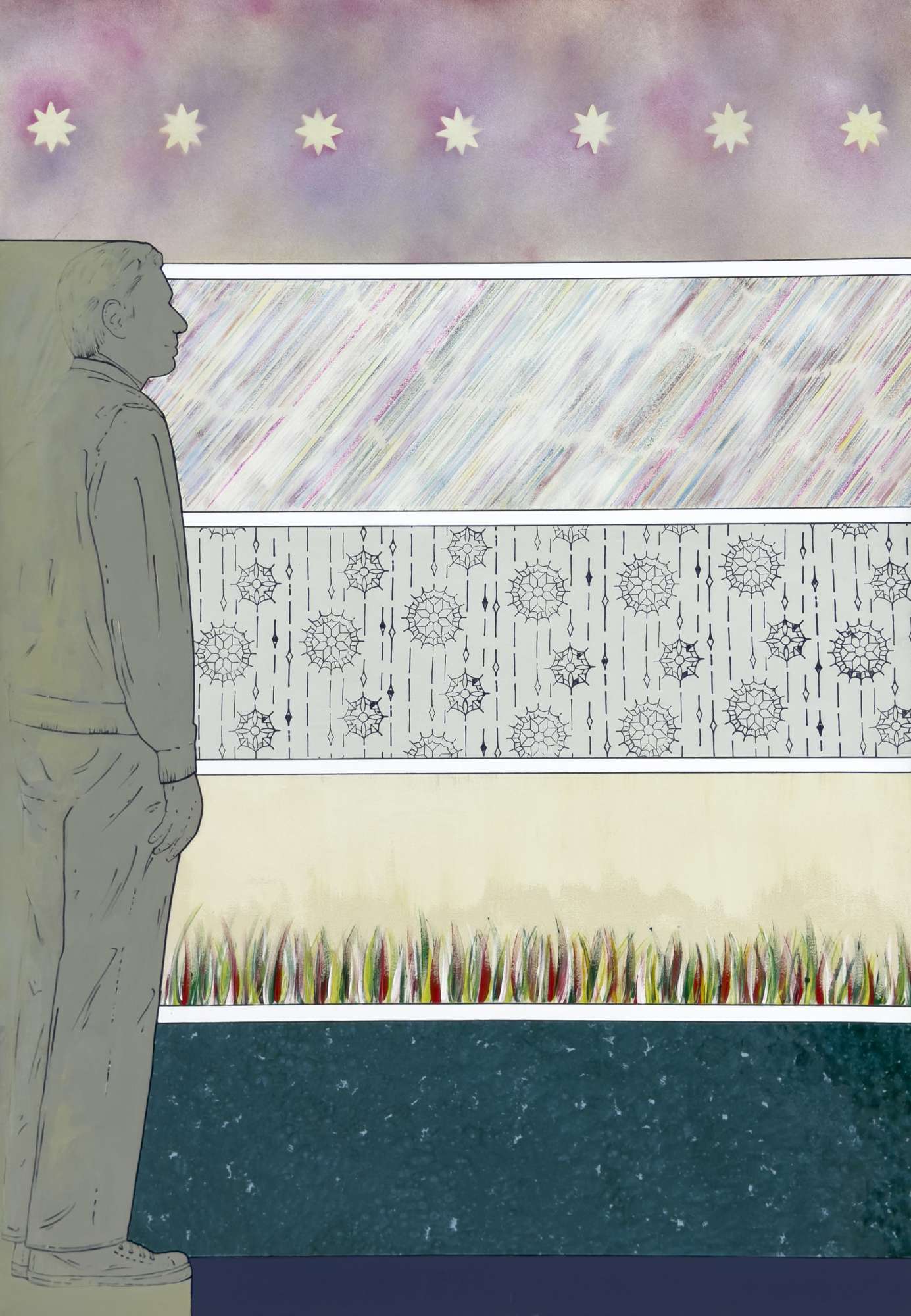 Renato Mambor, Osservatore e coltivazioni 1, 2010, acrilico su tela tamburata, 170x120 cm, in fase di archiviazione, esposta in 'Il Masso Inamovibile” Museo dell'Abbazia di Montecassino, 2022, pubblicata in 'Storytelling' Londra 2011, pag. 161; 'Diffusivum sui - l'altro e il concettuale' - Maretti Editore, Arezzo, Fortezza Medicea, 2023/2024, pag 90 e 91, opera soggetta a diritto di seguito