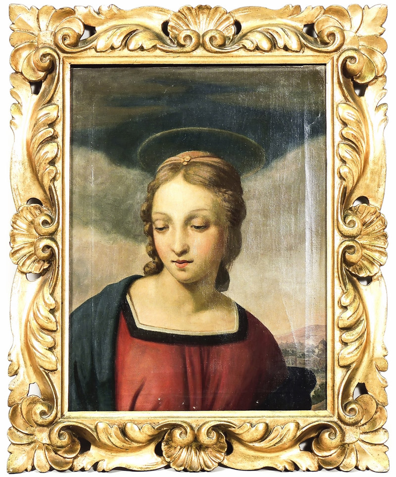 DA RAFFAELLO - FROM RAFFAELLO La Madonna del Cardellino - The Madonna of the Goldfinch olio su tela - oil on canvas, in cornice in legno intagliato e dorato cm 40x30
