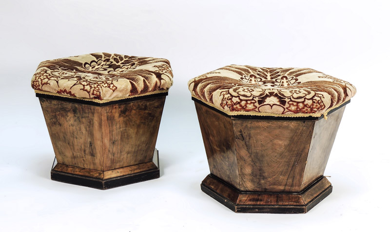 COPPIA DI POUF ESAGONALI IN RADICA DI NOCE - PAIR OF HEXAGONAL BURR WALNUT POUFFES Art Déco en pendant con i lotti precedenti