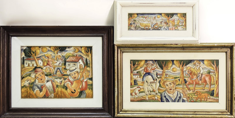 ROBERTO SGUANCI Paesaggi con personaggi - Landscapes with Figures tre dipinti ad olio inciso su cartone - trhee carved oils on cardboard, firmati, al verso firmati e titolati, in cornice (3) cm 25x50, cm 30x40 e cm 10x32