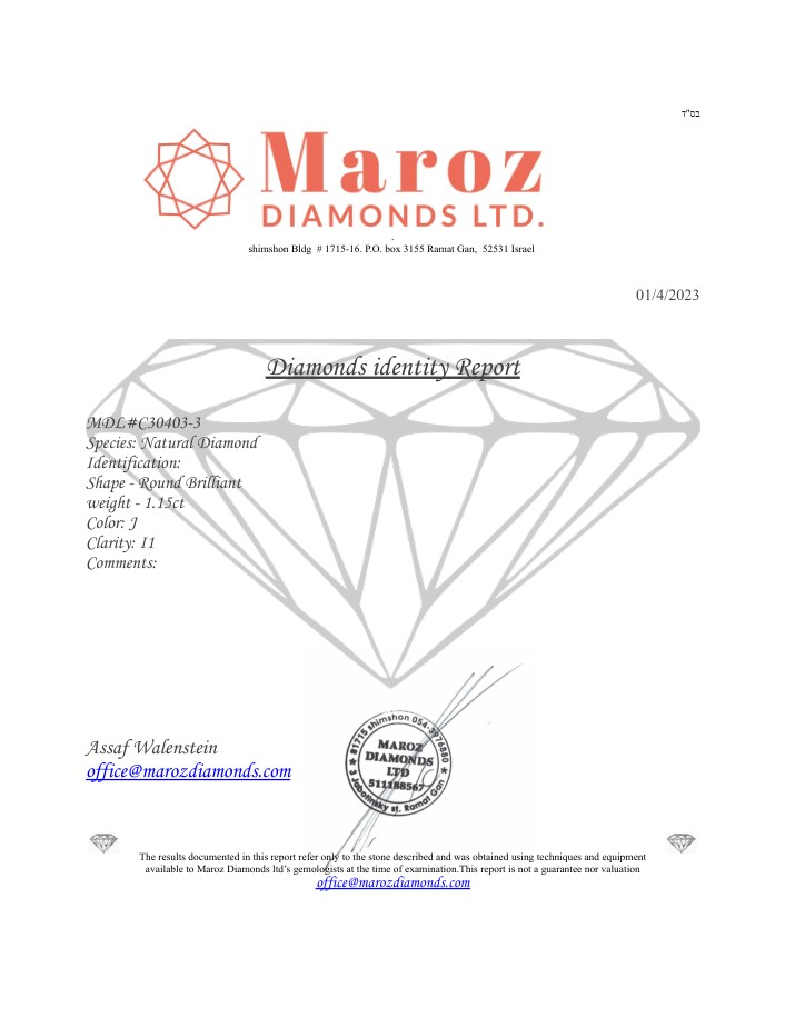 DIAMANTE NATURAL POLISHED 1,15 CARATI COLORE I- PUREZZA I1 - TAGLIO BRILLANTE - CERTIFICATO GEMMOLOGICO MAROZ DIAMONDS LTD MEMBRO ISRAEL DIAMOND EXCHANGE - C30403-3
