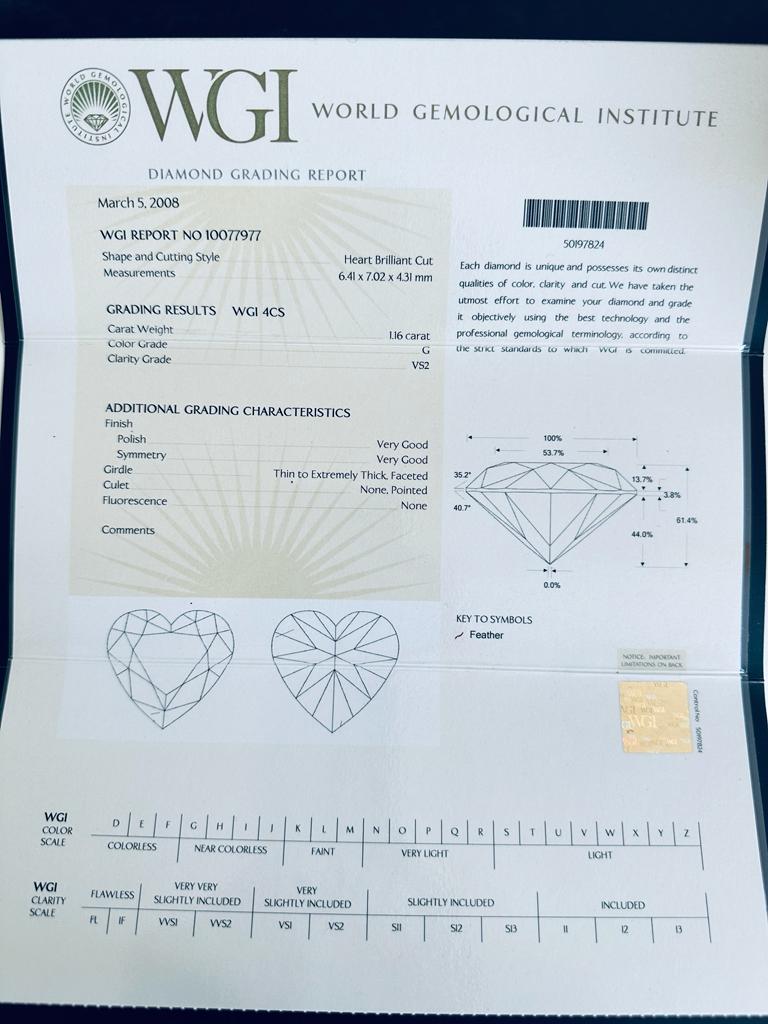 Lotto 34 | DIAMANTE 1,16 CT G - VS2 - TAGLIO CUORE - CERTIFICATO WGI - DH30111