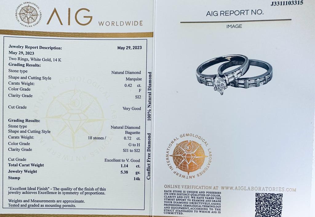 ANELLI IN ORO BIANCO 14K 5.39 GR CON DIAMANTI PER 0.72 CT COLOR G-H PUREZZA SI1 TAGLIO MARCHESE 0.42 CARATI COLORE F PUREZZA SI2 TAGLIA 5,6 CERTIFICATO AIG - RNG30517