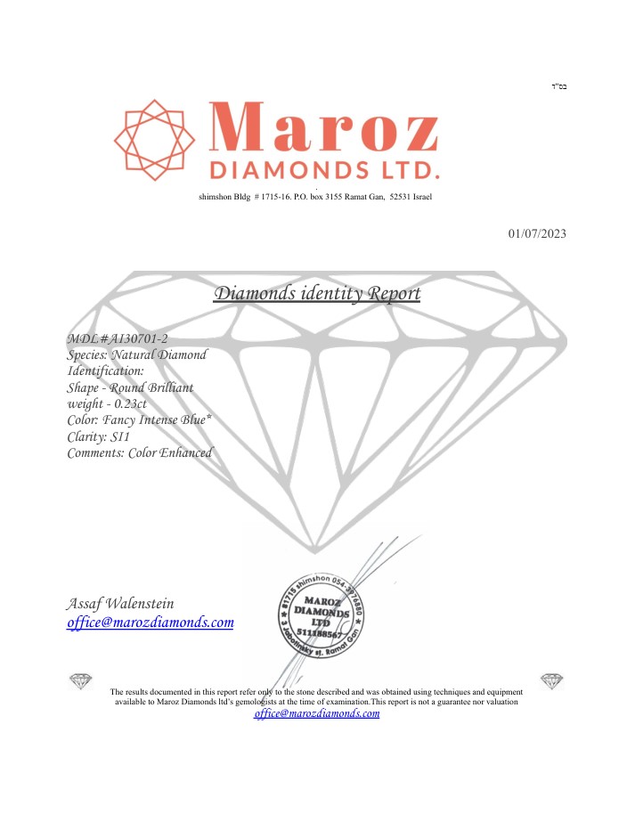 DIAMANTE NATURAL POLISHED 0,23 CARATI COLORE FANCY BLU INTENSO* - PUREZZA SI1 - TAGLIO BRILLANTE - CERTIFICATO GEMMOLOGICO MAROZ DIAMONDS LTD MEMBRO ISRAEL DIAMOND EXCHANGE - AI30701-2