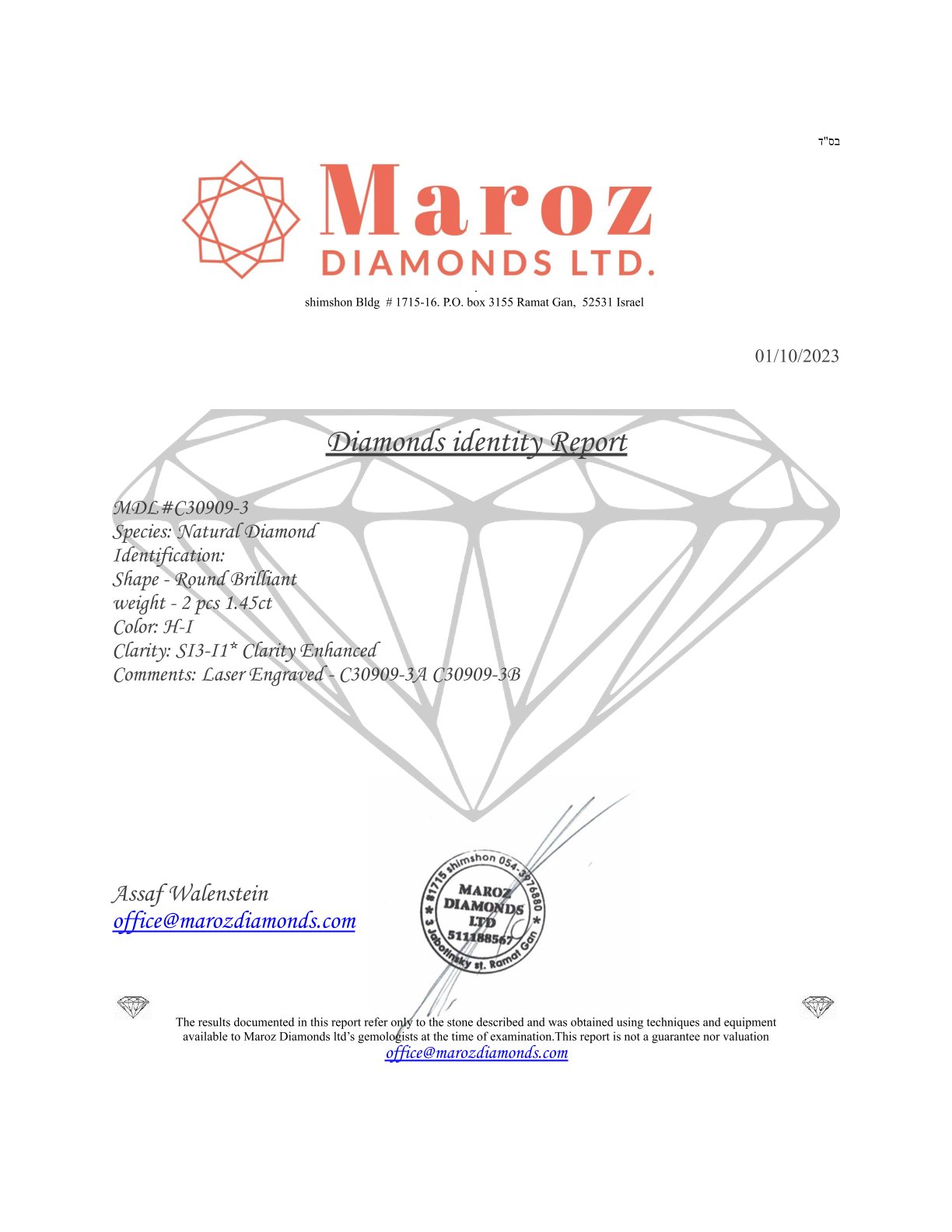 2 DIAMANTI PUREZZA ESALTATA* 1,45 CARATI COLORE H-I - PUREZZA SI3-I1 - TAGLIO BRILLANTE - CERTIFICATO GEMMOLOGICO MAROZ DIAMONDS LTD MEMBRO ISRAEL DIAMOND EXCHANGE - C30909-3