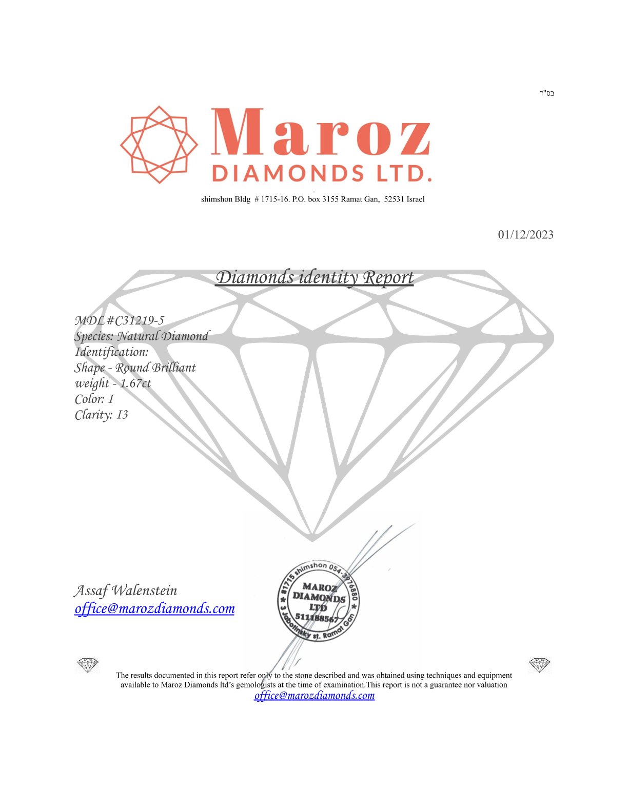 DIAMANTE 1,67 CARATI COLORE I - PUREZZA I3 - TAGLIO BRILLANTE - CERTIFICATO GEMMOLOGICO MAROZ DIAMONDS LTD MEMBRO ISRAEL DIAMOND EXCHANGE - C31219-5