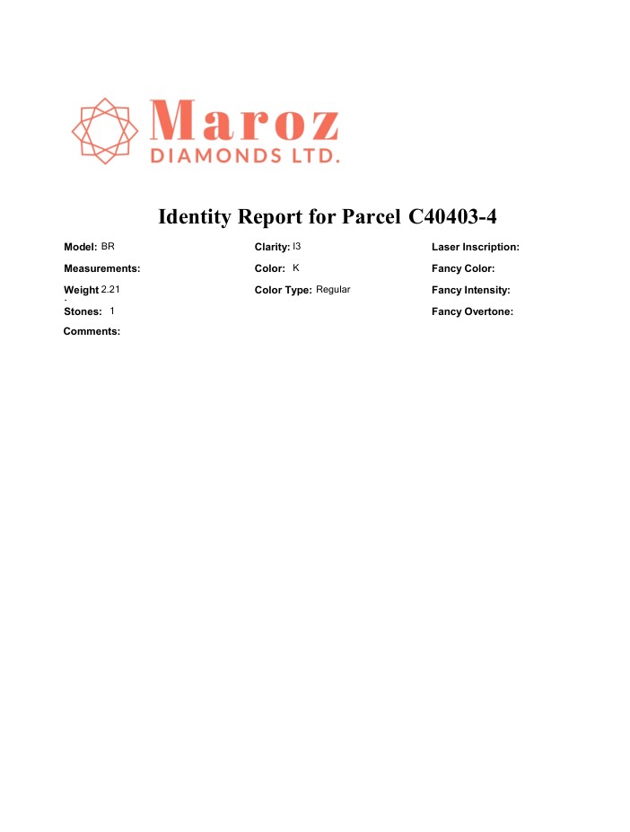 DIAMANTE NATURAL POLISHED 2,21 CT COLORE K - PUREZZA I3 - TAGLIO BRILLANTE - CERTIFICATO GEMMOLOGICO MAROZ DIAMONDS LTD MEMBRO ISRAEL DIAMOND EXCHANGE - C40403-4