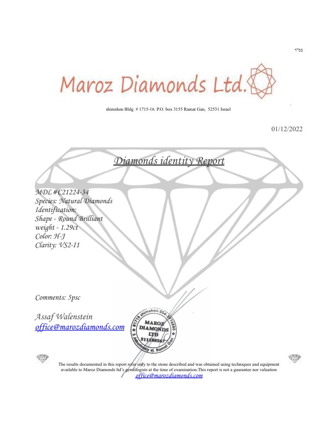 5 DIAMANTI NATURAL POLISHED 1,29 CARATI H-J - PUREZZA VS2-I1 - TAGLIO BRILLANTE - CERTIFICATO GEMMOLOGICO MAROZ DIAMONDS LTD MEMBRO ISRAEL DIAMOND EXCHANGE - C21224-34