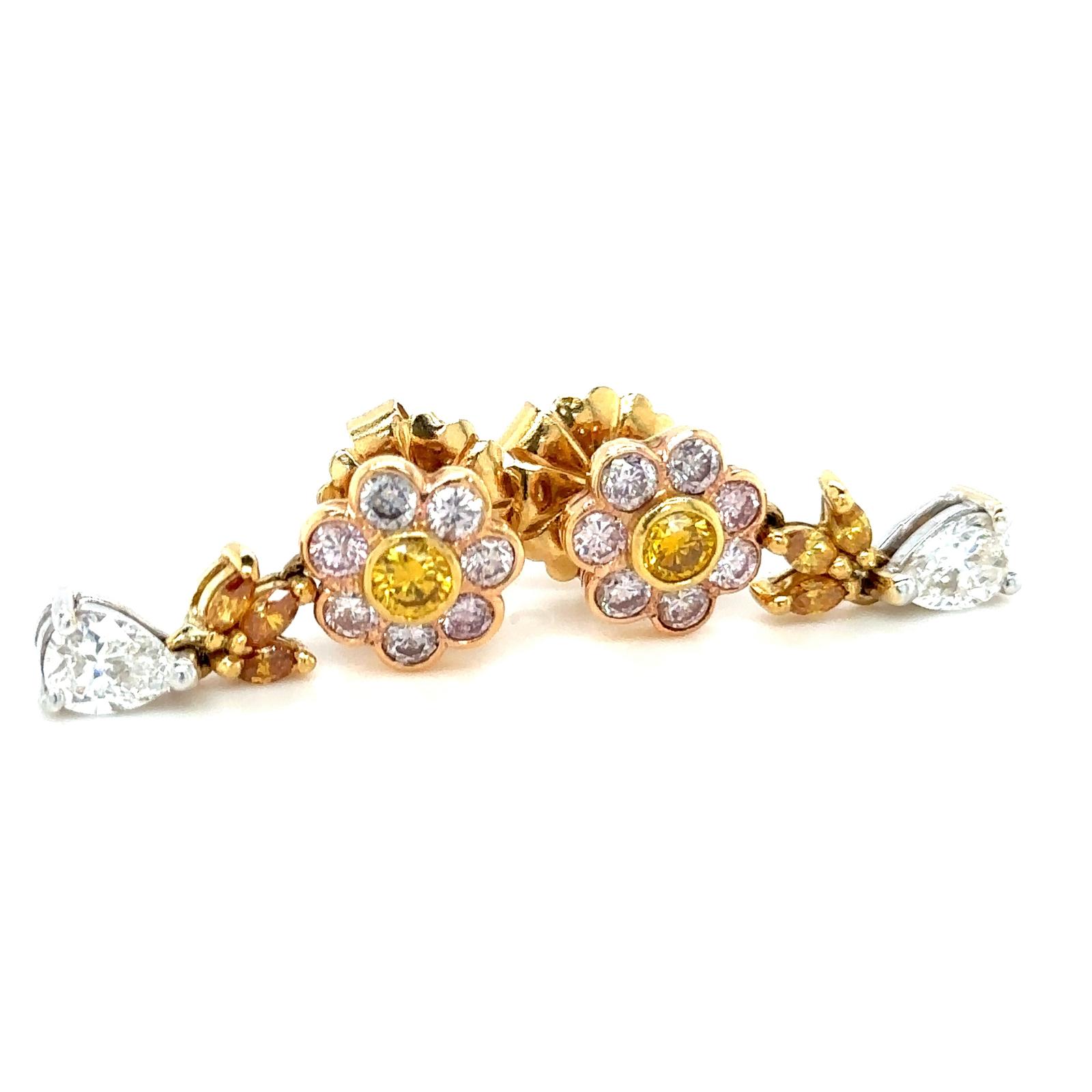 ORECCHINI IN ORO GIALLO 18K 6.46 GR - FIORE CON DIAMANTI PER 2.76 CARATI FANCY ROSA, FANCY INTENSE GIALLO E DIAMANTI COLORE H PUREZZA SI1 - 2.5CM - CERTIFICATO GEMMOLOGICO MAROZ DIAMONDS LTD MEMBRO ISRAEL DIAMOND EXCHANGE - HR1003