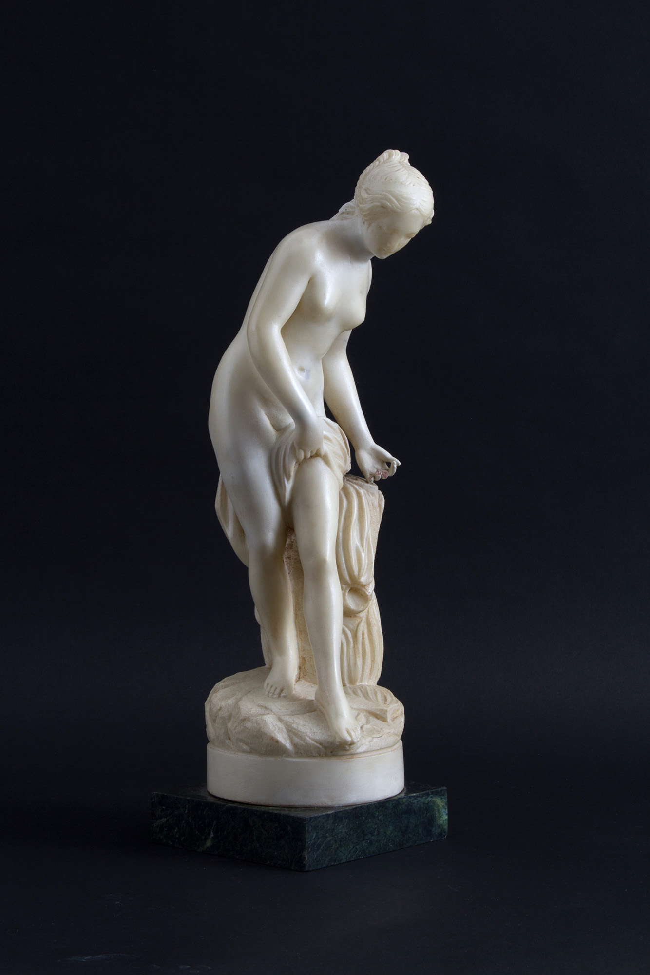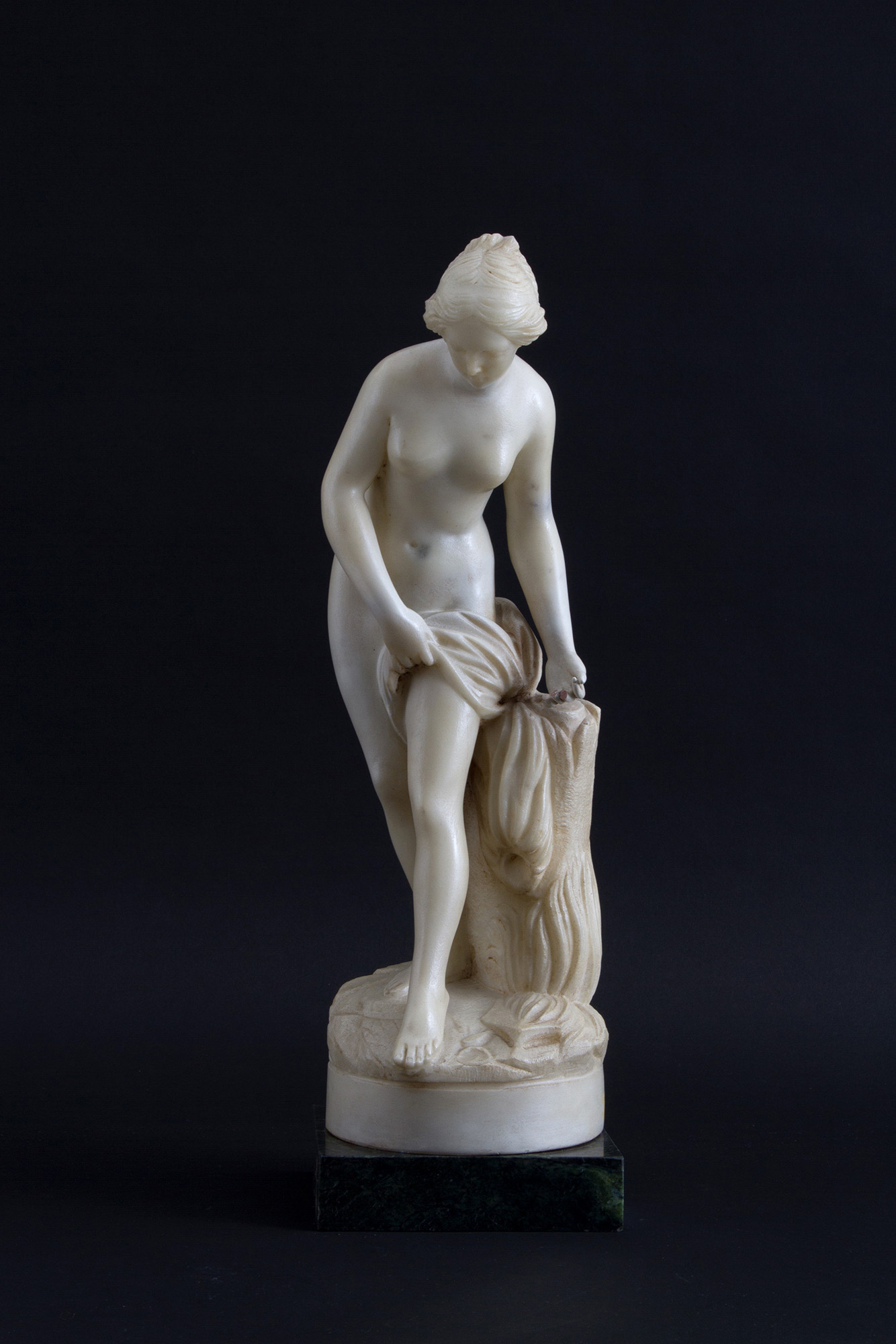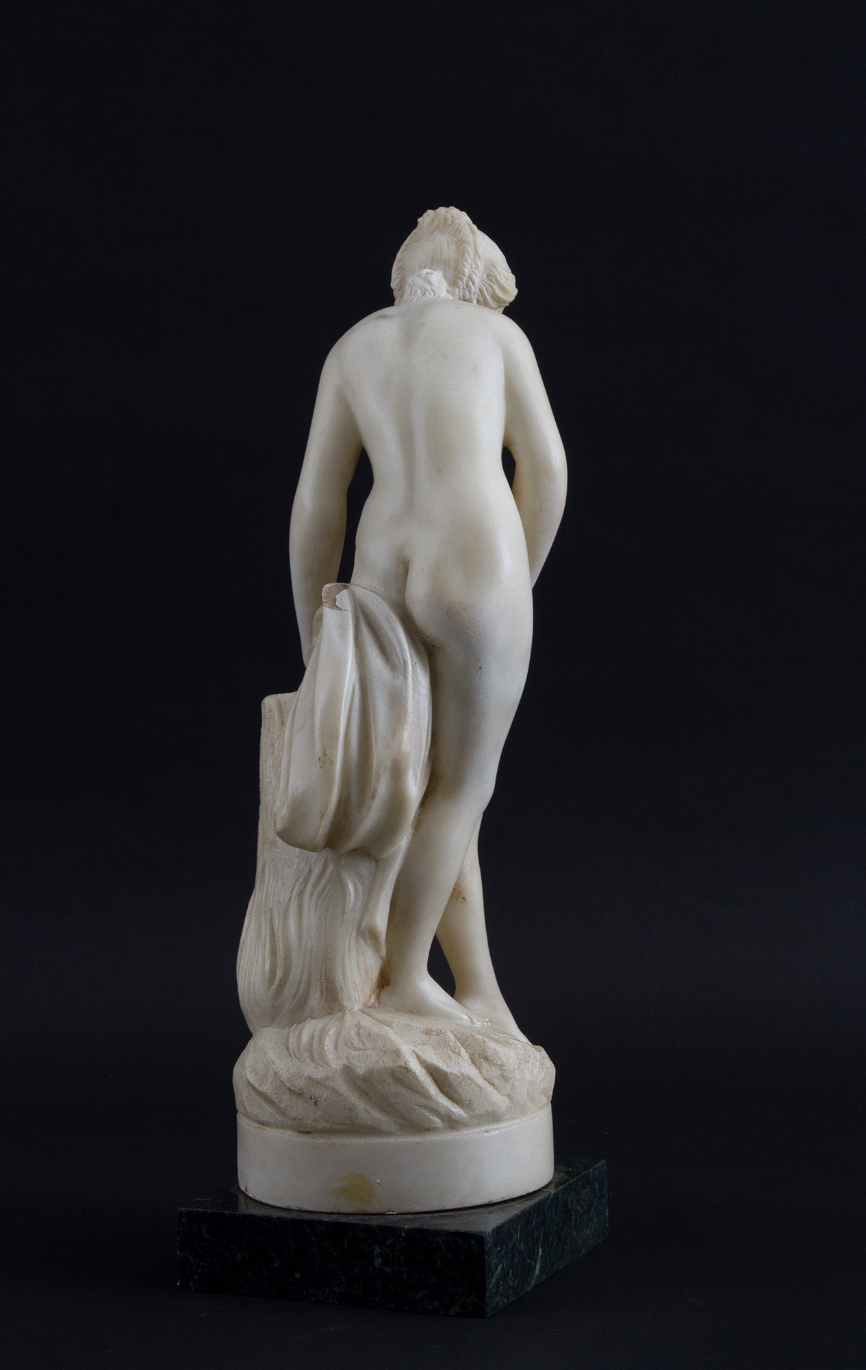 White marble sculpture depicting "FEMALE FIGURE". Base in green marble. 19th century. Defects, restorations and shortcomings.  49x15x15 cm approx. Scultura in marmo bianco raffigurante "FIGURA FEMMINILE". Base in marmo verde. XIX secolo. Difetti, restauri e mancanze.  49x15x15 cm ca.